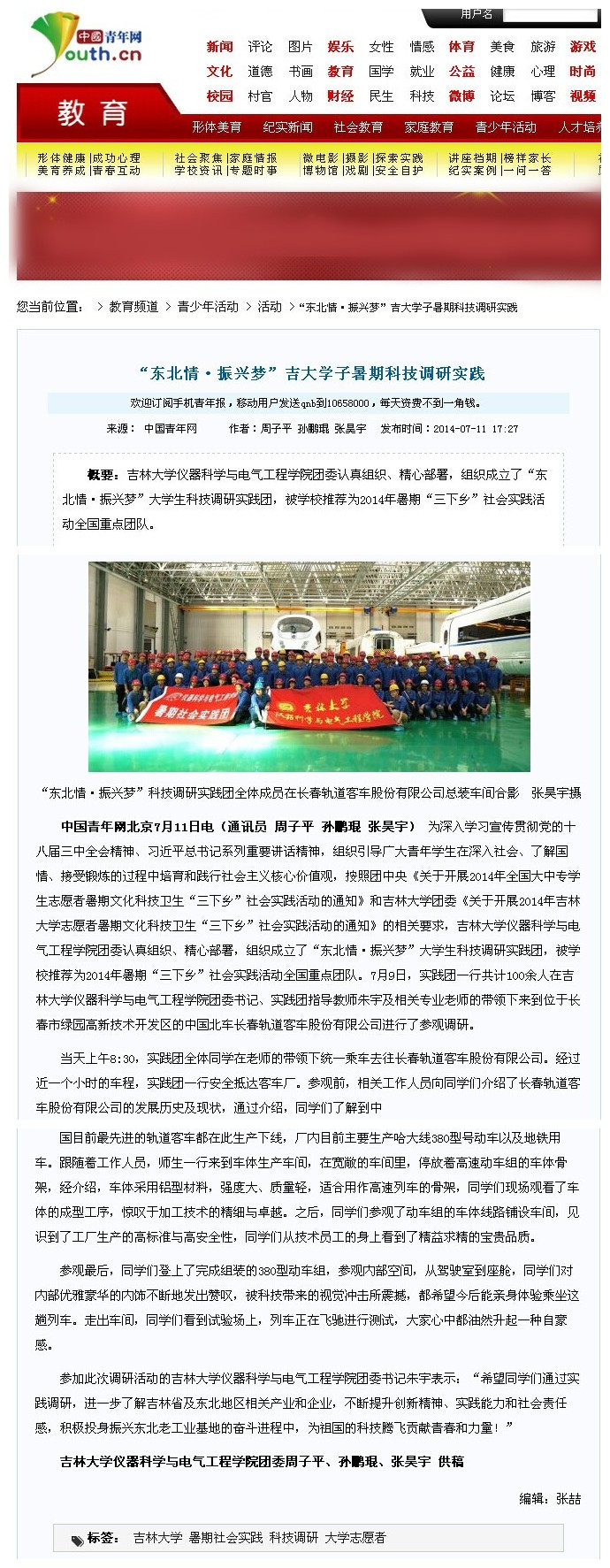为深入学习宣传贯彻党的十八届三中全会精神、习近平总书记系列重要讲话精神,组织引导广大青年员工在深入社会、了解国情、接受锻炼的过程中培育和践行社会主义核心价值观,按照团中央《关于开展2014年全国大中专员工志愿者暑期文化科技卫生“三下乡”社会实践活动的通知》和best365体育亚洲官网团委《关于开展2014年best365体育亚洲官网志愿者暑期文化科技卫生“三下乡”社会实践活动的通知》的相关要求,仪器科学与电气工程公司团委组织成立了“东北情·振兴梦”老员工科技调研实践团,被公司推荐为2014年暑期“三下乡”社会实践活动全国重点团队。201479日,best365体育亚洲“东北情·振兴梦”实践团开展的中国北车长春轨道客车股份有限公司科技调研活动受到了共青团中央主办的中央重点新闻网站——中国青年网的关注报道,中国青年网于711日以《“东北情·振兴梦”吉大学子暑期科技调研实践》为题做了详细介绍。