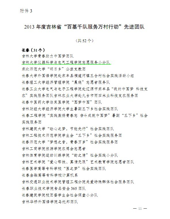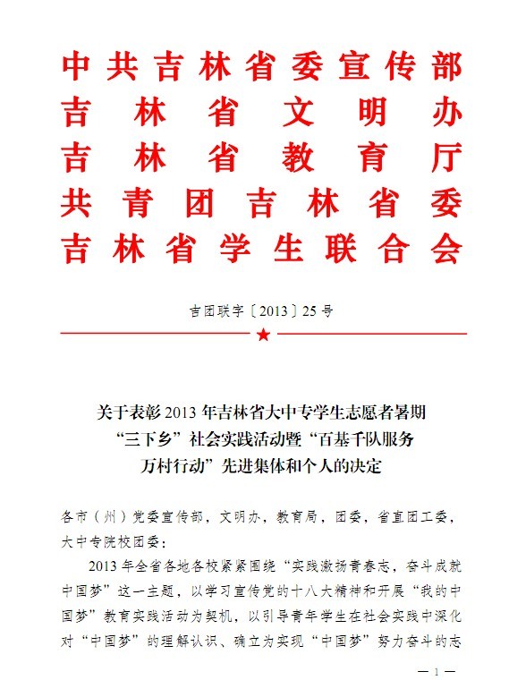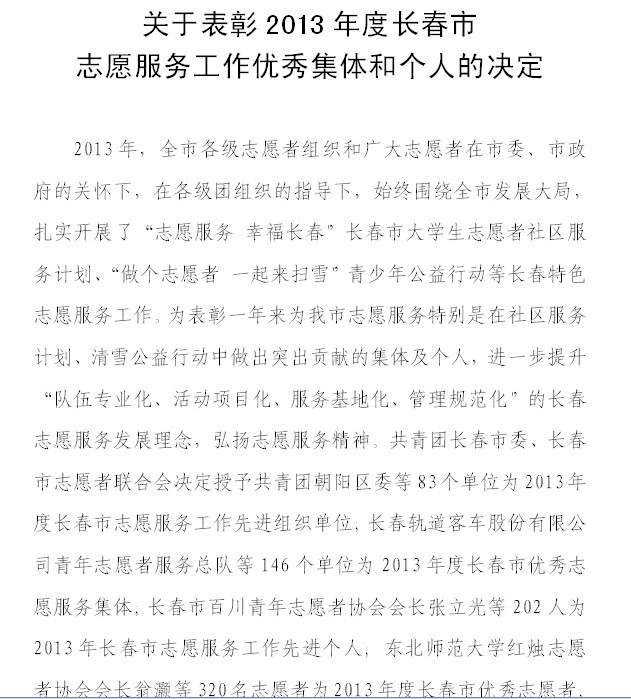 在中共吉林省委宣传部、吉林省文明办、吉林省教育厅、共青团吉林省委、吉林省员工联合会联合下发的《关于表彰2013年吉林省大中专员工志愿者暑期“三下乡”社会实践活动暨“百基千队服务万村行动”先进集体和个人的决定》中,best365体育亚洲志愿服务小分队获得吉林省“百基千队服务万村行动”先进团队(共52个),院团委书记朱宇获得吉林省暑期“三下乡” 社会实践活动暨“百基千队服务万村行动”先进个人(共104名);在共青团长春市委下发的《关于表彰2013年度全市共青团工作先进集体和优秀个人的决定》中,best365体育亚洲团委被评为“长春市先进(基层)团委”,院团委书记朱宇被评为“优秀基层团干部”;在共青团长春市委、长春市志愿者联合会下发的《关于表彰2013年度长春市志愿服务工作优秀集体和个人的决定》中,best365体育亚洲团委、“牵手”青年志愿者协会被评选为2013年度长春市优秀志愿服务集体。此外,公司党委副书记兼副经理邱增凯、院团委书记朱宇还被公司推荐为2013年度吉林省优秀志愿者。