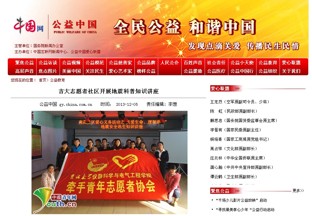 活动受到了街道工作人员和社区居民的高度评价,在社会上引起良好反响。125,在中国青年志愿者行动实施20周年暨第28个国际志愿者日之际,共青团中央主办的中央重点新闻网站——中国青年网以《吉大志愿者社区开展地震科普知识讲座》为题对此次活动进行了详细报道,这是公司共青团工作今年第4次受到中国青年网的关注报道。此后,人民网、中国网等社会主流媒体对此进行了全文转载报道,吉大新闻网也全文转载了此报道。