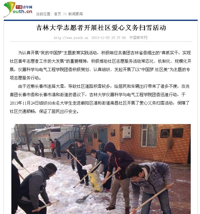 活动受到了街道工作人员和社区居民的高度评价,在社会上引起良好反响。11月25日,共青团中央主办的中央重点新闻网站——中国青年网以《best365体育亚洲官网志愿者开展社区爱心义务扫雪活动》为题对此次活动进行了详细报道,这是公司共青团工作今年第3次受到中国青年网的关注报道。