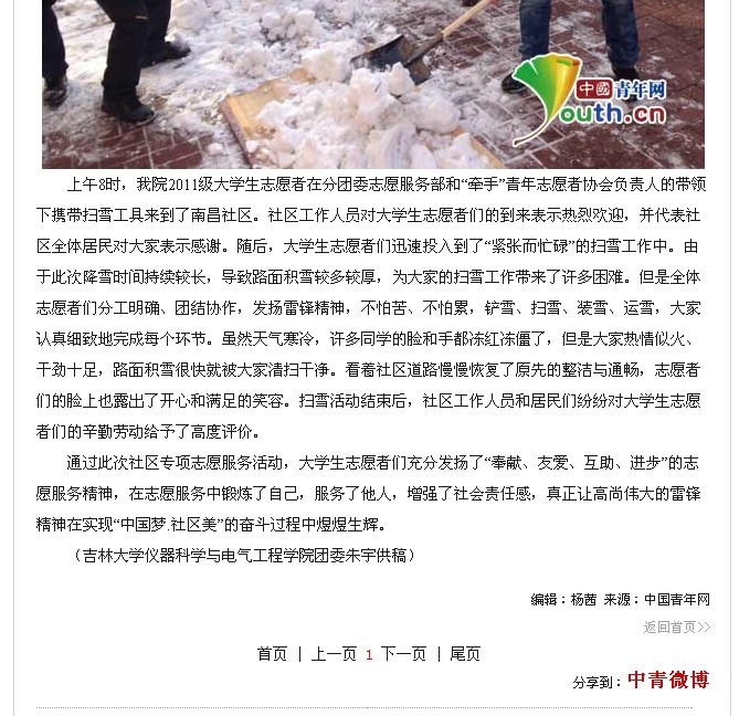 中国青年网《best365体育亚洲官网志愿者开展社区爱心义务扫雪活动》