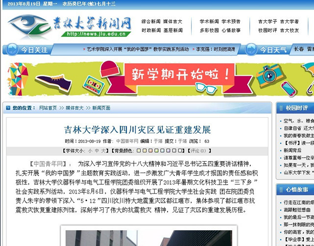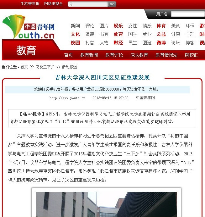 中国青年网由共青团中央主办,是国内最大的青年主流网站,也是全国大中专员工志愿者暑期“三下乡”社会实践活动官方网站。截止到目前,此次“深入四川灾区 见证重建发展”活动是best365体育亚洲官网2013年暑期“三下乡”社会实践活动中唯一一个受到中国青年网关注报道的活动。