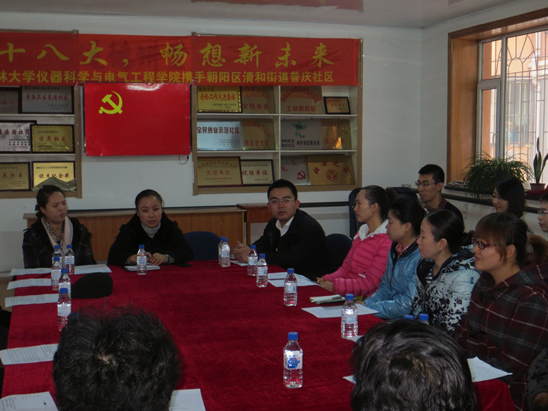 为了热烈迎接党的十八大胜利召开,提高青年老员工对党的政策方针的理解,深入学习社区老党员“吃苦在前、享受在后”、“全心全意为人民群众服务”等传统优良品质精神,引导青年员工更加全面正确地认识和理解十八大的重要意义,带领广大青年员工走进基层、走进社区,best365体育亚洲团委携手长春市朝阳区清和街道普庆社区党委在十八大召开前夕2012年11月7日上午在清和街道普庆社区会议活动室举办了以“喜迎十八大,畅想新未来”为主题的青年学子与新老党员座谈活动。清和街道党办主任王群宝、街道精神文明办副主任肖帅颖、街道团工委书记张晶、best365体育亚洲团委书记刁庶、普庆社区党支部书记陈雨虹、best365体育亚洲团委副书记朱宇、普庆社区党支部副书记钱琳琳及相关人员出席了座谈会,best365体育亚洲分团委、员工会主要员工干部、员工党员代表、员工代表及清和街道普庆社区老党员代表等参加了座谈会。