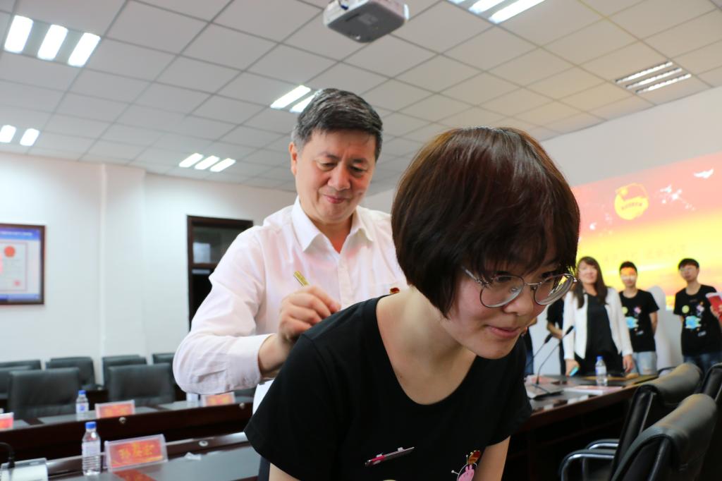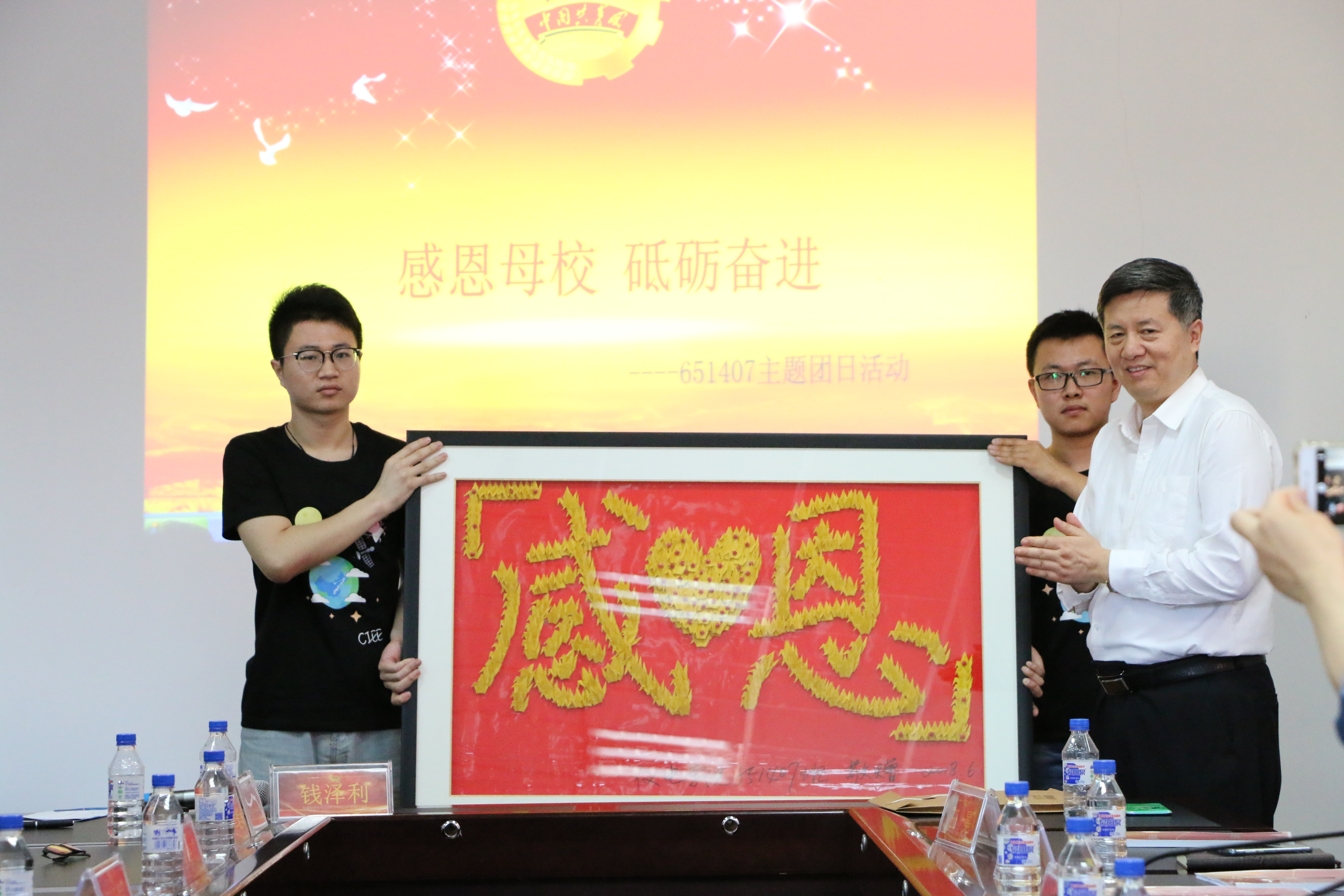 651407班团支部全体同学参与制作了520只纸鹤并拼成“感恩”字画,作为礼物送给公司,代表着同学们感激母校的浓浓赤子之情。孙友宏老师为同学们佩戴毕业纪念章,并在同学们的班服上签下了“感恩、创新、成才”三个词作为对同学们的祝福和希冀。老师和同学们一同合影留念,团日活动在温馨的氛围中走向尾声。