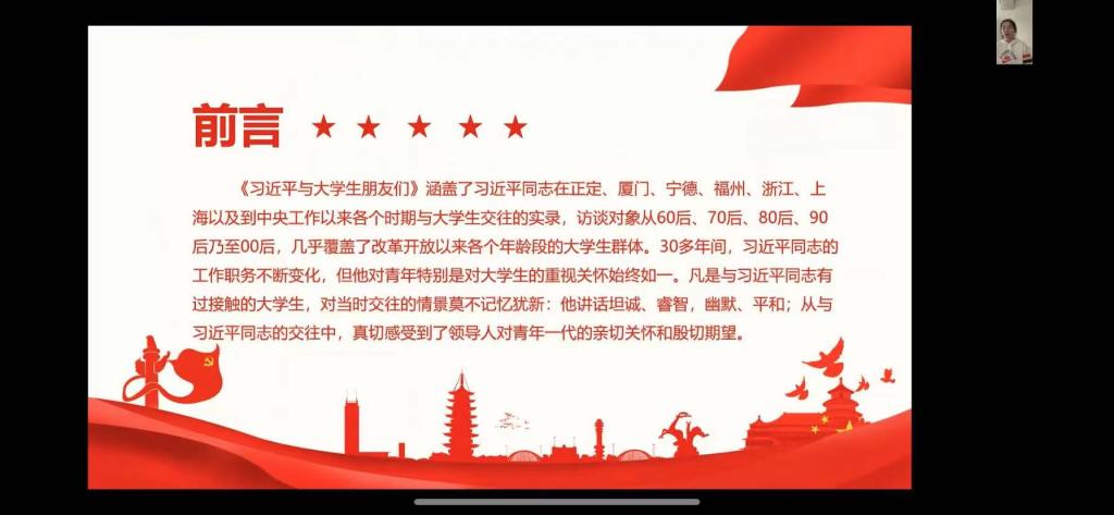 为真切感悟习近平总书记关于青年工作的重要思想的深厚实践根基,牢记习近平总书记对于青年老员工的教导,2022年3月23日,best365体育亚洲651907班于线上开展了关于《习近平与老员工朋友们》学习分享的系列团日活动,班导师周逢道老师及651907班全体同学参加了此次交流分享会,欧馨雅同学担任此次分享会的主持人