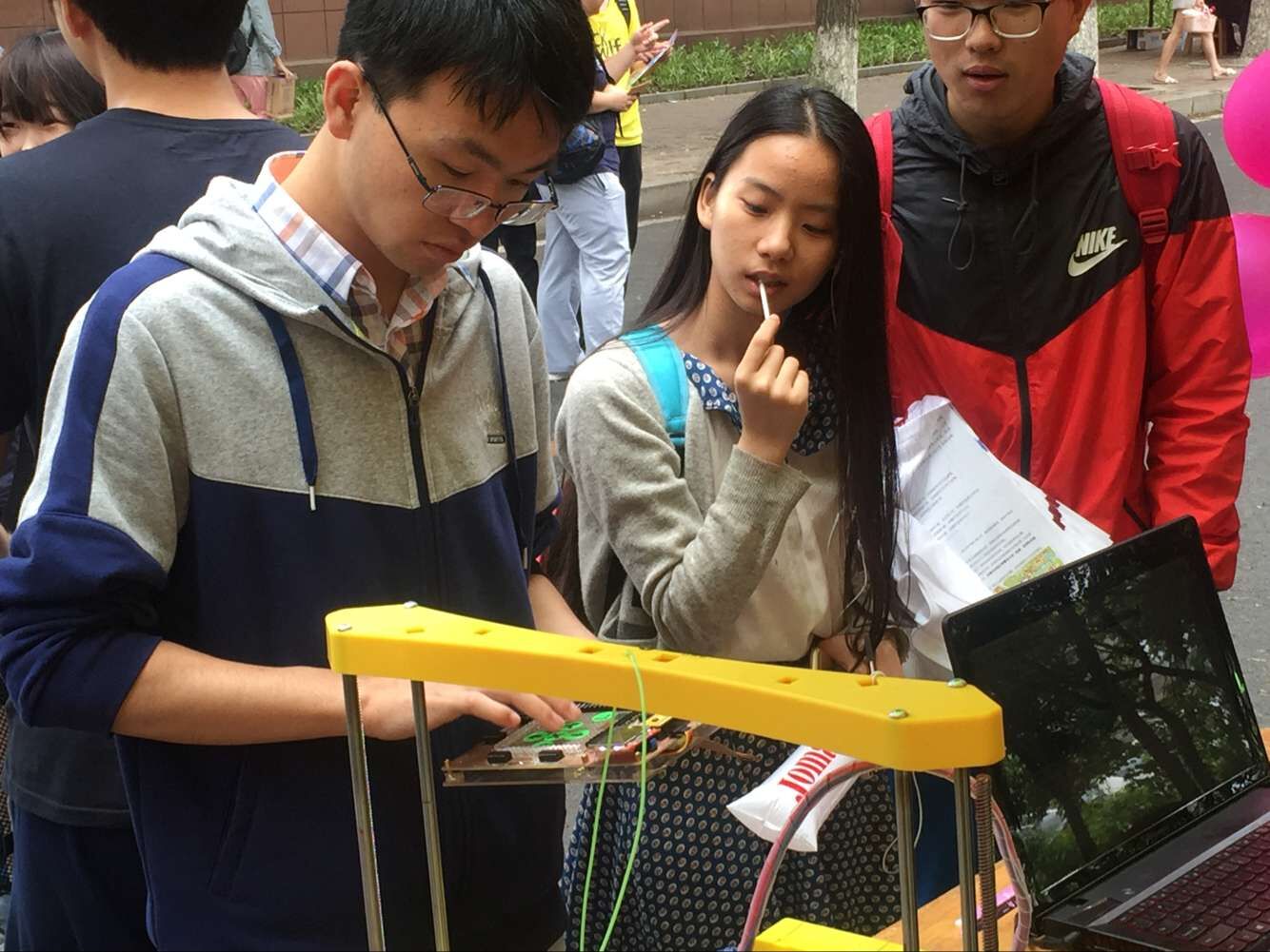 早些时分,尽管嘉年华活动还未开始,可是公司科协的帐篷前就已经有不少的同学被正准备展览的公司同学在电子设计大赛中的优秀科技作品吸引了过来。看着正在调试中的3D打印机、光控时控调光玻璃、等离子音响、自平衡小车等出色的作品,大家十分好奇,更多的还是惊叹。这些制作精美、创意十足的电子设计作品,让同学们和市民朋友感受着世界的新奇和科技的魅力。上午11点,嘉年华活动正式开始。电子科技协会的帐篷前马上便围满了慕名前来的吉大师生和市民朋友,大家都好奇地向科协的同学们提出自己的问题。科协成员一一为大家展示每个作品的功能,耐心地回答大家提出的问题。本次活动还准备了互动环节,各位游客既可以选择列举自己所了解的电子设计领域中常见的10种基本元器件名称,也可以来用DIY电子琴演奏一首自己熟悉的曲目等等。在科协的同学们的提示和帮助下,同学们都在收获新知识的快乐中完成了任务,并都满意地给电子科技协会点了大大的赞。