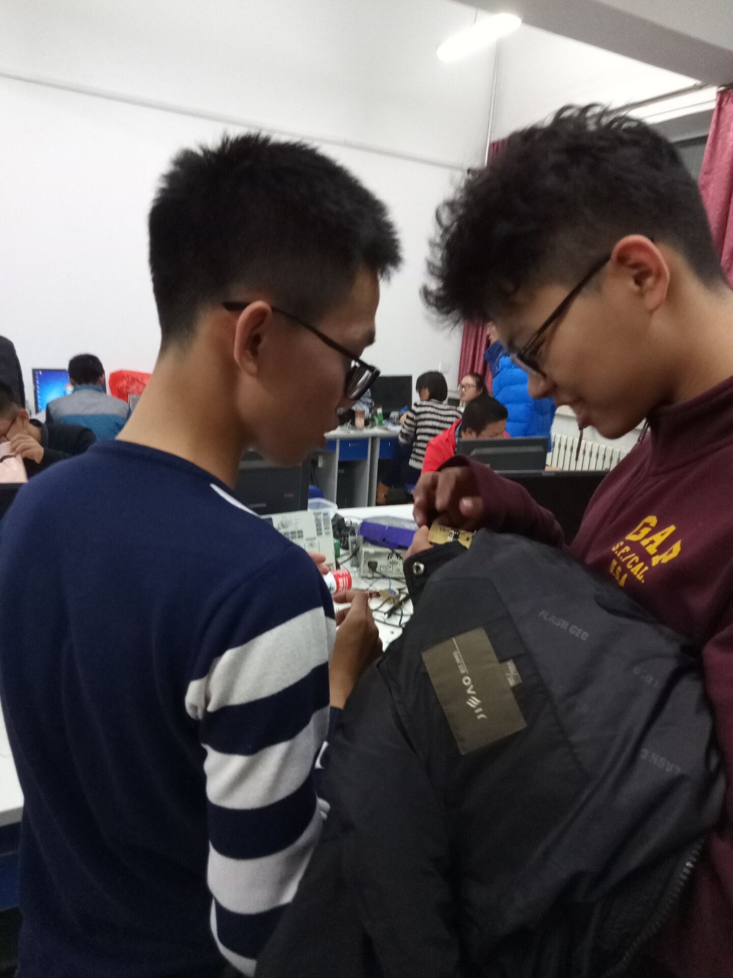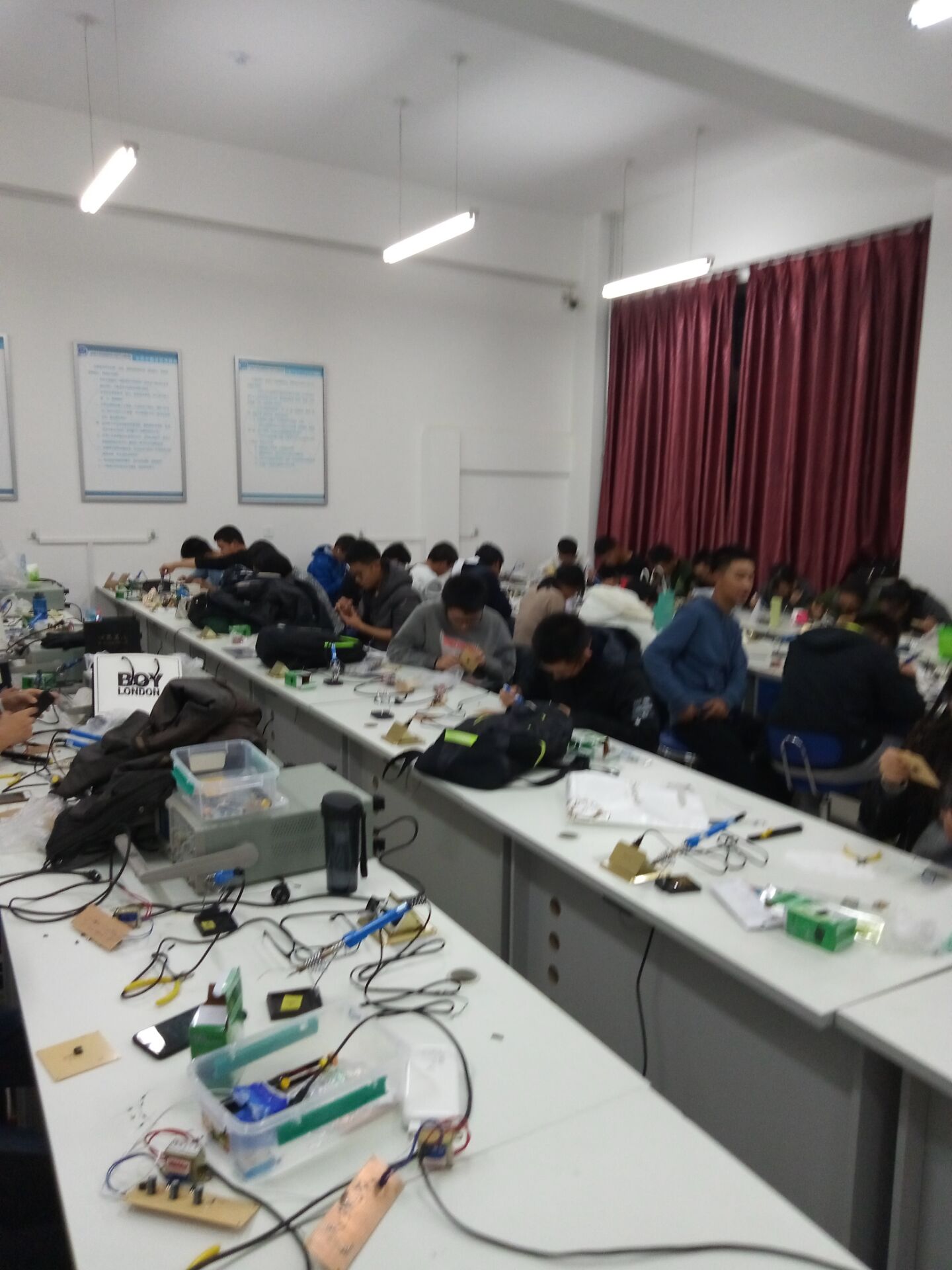 此次培训的内容为红外报警灯电路的焊接以及对上一次培训中电源焊接的检测验收。在培训过程中,2016级相关负责人没有过多的统一讲解,而是针对同学在实践过程中出现的问题进行答疑解惑。培训期间首先2017级新生用色环电阻法识别电阻阻值,找到此次培训所需要的电阻,然后根据负责人给出的电路图和芯片引脚分布图设计自己的电路板。2016级相关负责人走到新生们中间,及时回答问题,新生间也互相探讨知识,学习气氛高涨。最后2017级新生完成电路焊接后,交由2016级相关负责人进行验收,并为他们指出电路中的错误及走锡、布局等问题。当最后报警灯实现闪烁功能并通过验收时,新生们露出了开心的笑容。亲自动手实践极大地激发了新生们的学习热情,也使新生对理论与实践的结合有了更多更丰富的想法。