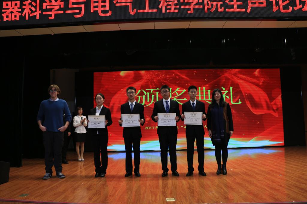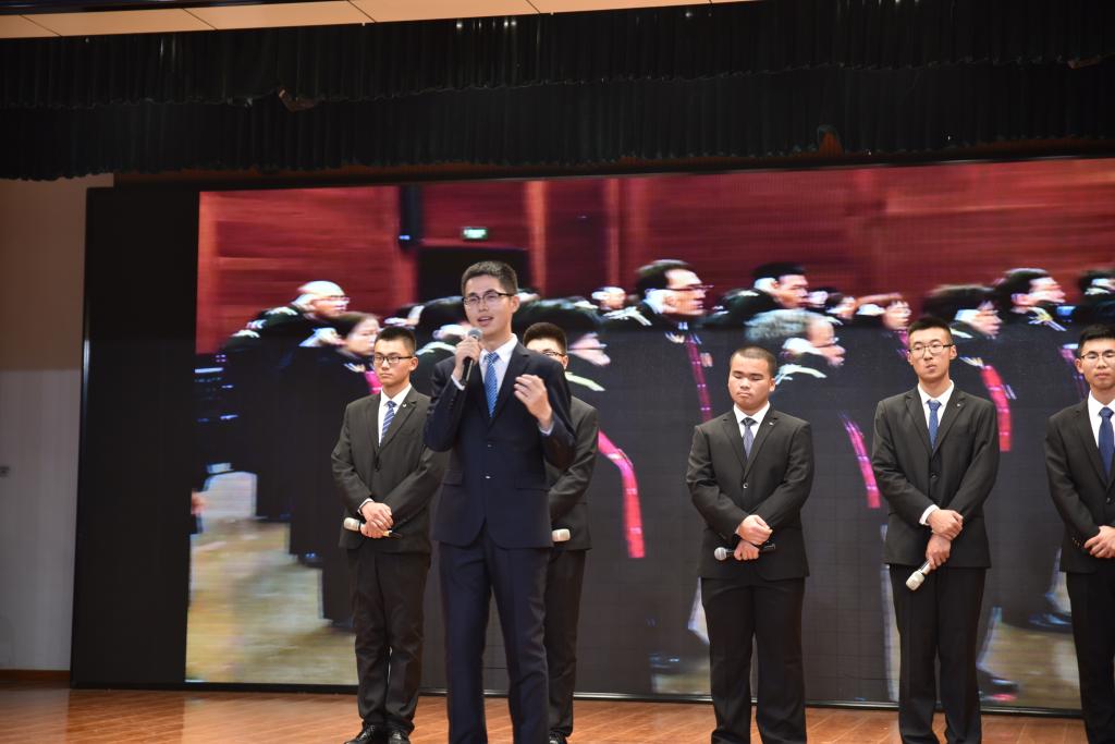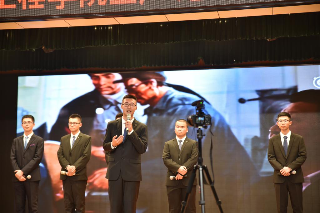 在此次汇报演出过程中六位社员用演讲脱口秀的方式进行了“不忘初心,回望十九大”专题演讲,表达了自己对十九大的看法与理解。演讲开始后,首先由主持人崔天成同学对十九大的背景进行了简要的介绍,2017级的陈宇峰与林晨希、郜泽霖与郭永甲、仲维一与刘熠三组同学分别选择了国防实力与教育、中国社会主要矛盾转变前后变化、“一带一路”外交发展三个话题、共六个方面向在场观众展现了十九大报告中所传达的成果与指导方针。演讲同学用风趣的语言和生动的比喻、事例向我们阐述了十九大的内容。现场同学们认真听取演讲并对中国在五年以来的发展与变革有了更深刻的认识。而演讲同学联系生活的部分更使同学们感同身受并多次爆发出热烈的掌声。随后,马克思主义公司副教授王成老师对整个活动进行了点评,对活动的举办表示肯定并对六位同学的表现给予了赞扬,最终由公共外语教育公司杨梅老师和Alex Cerola老师为演讲同学颁奖。