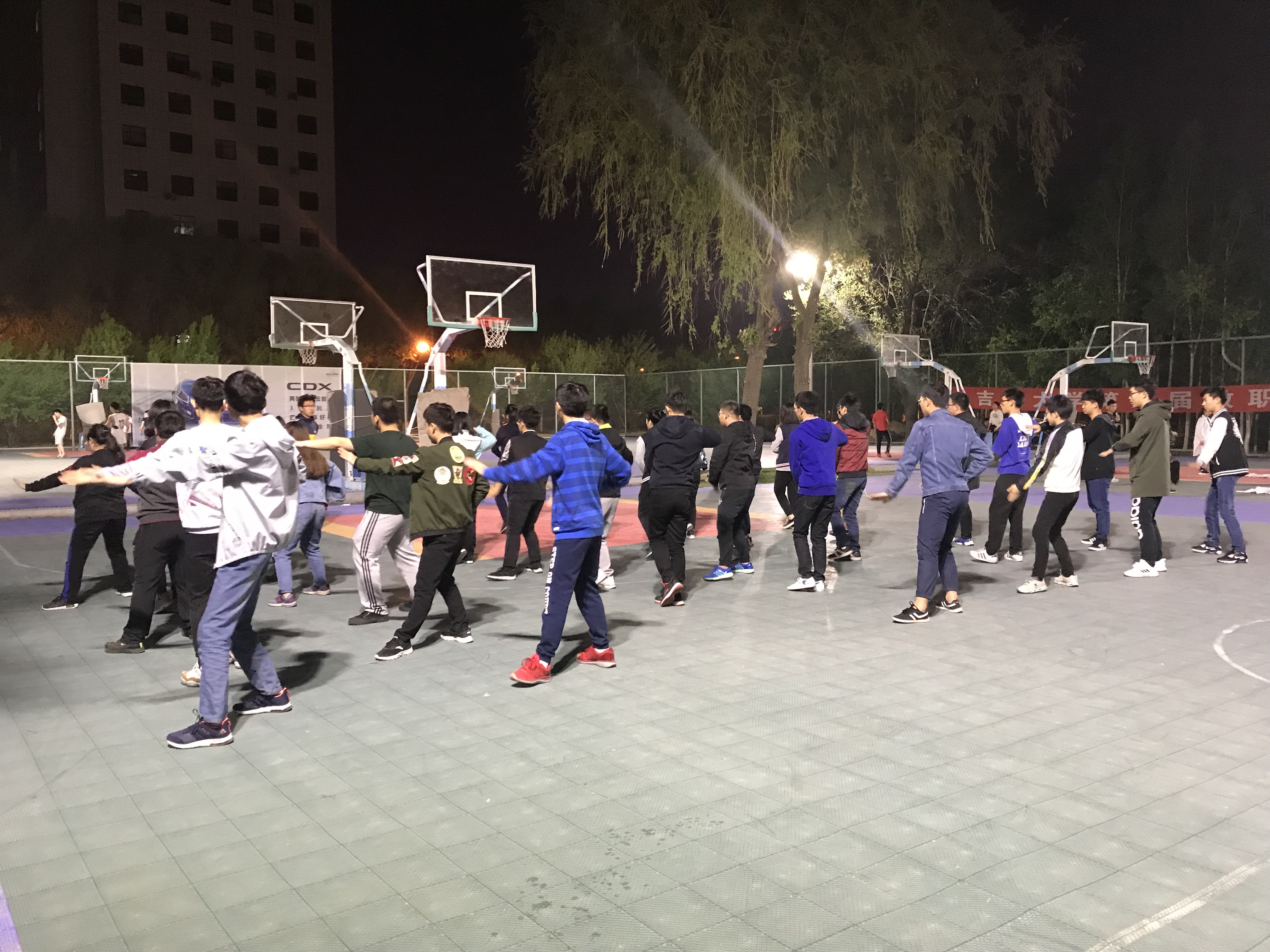 此次训练由仪电公司团学组织组织开展,陈亦楠同学作为长拳教练指导同学们展开训练。 篮球场上,仪电学子们整齐地站成一个方队。秘书部副部组织活动有序进行。