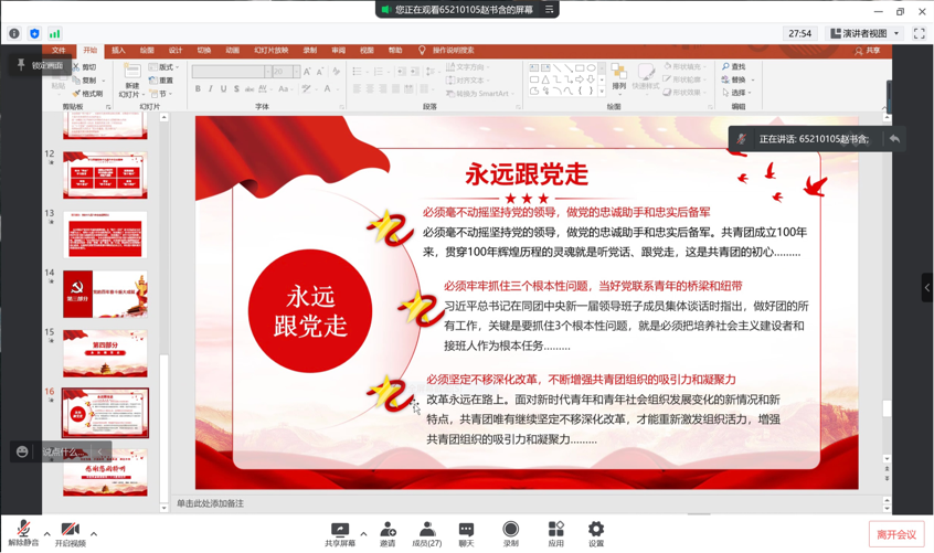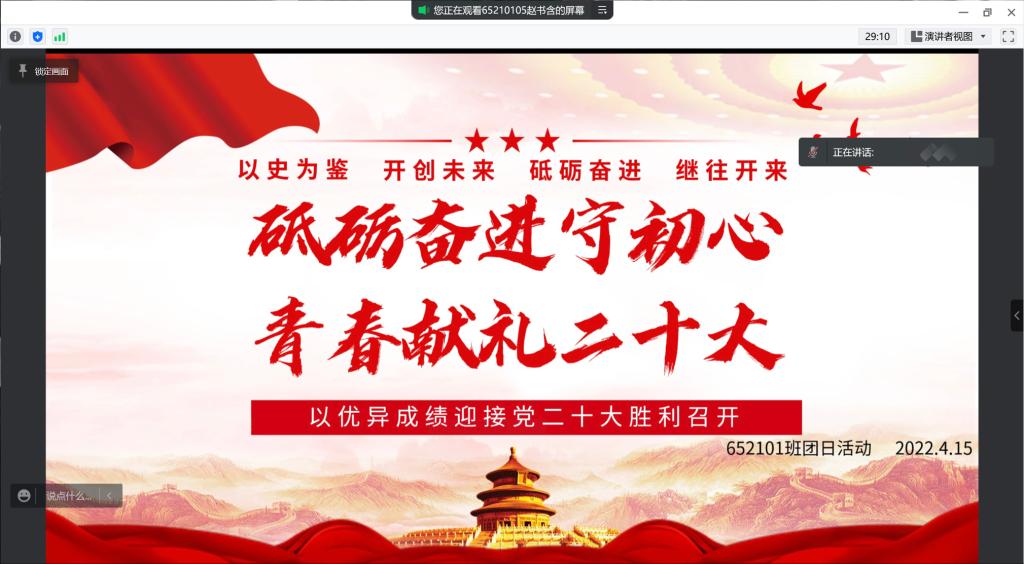 为教育青年团员深刻领会我党百年奋斗的历史经验,引导青年老员工牢记初心使命,增强自身本领,以优异成绩迎接党的二十大胜利召开,best365体育亚洲652101团支部于2022年4月15日15:00,线上开展了主题为“喜迎二十大,永远跟党走,奋进新征程“的团日活动。团日活动由团支部书记赵书含同学主持,团支部全体同学参加了此次活动。