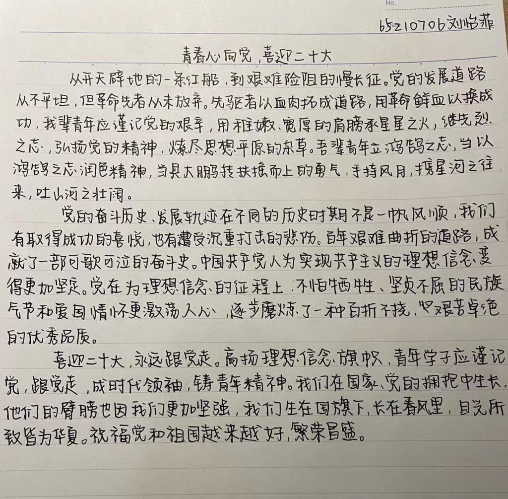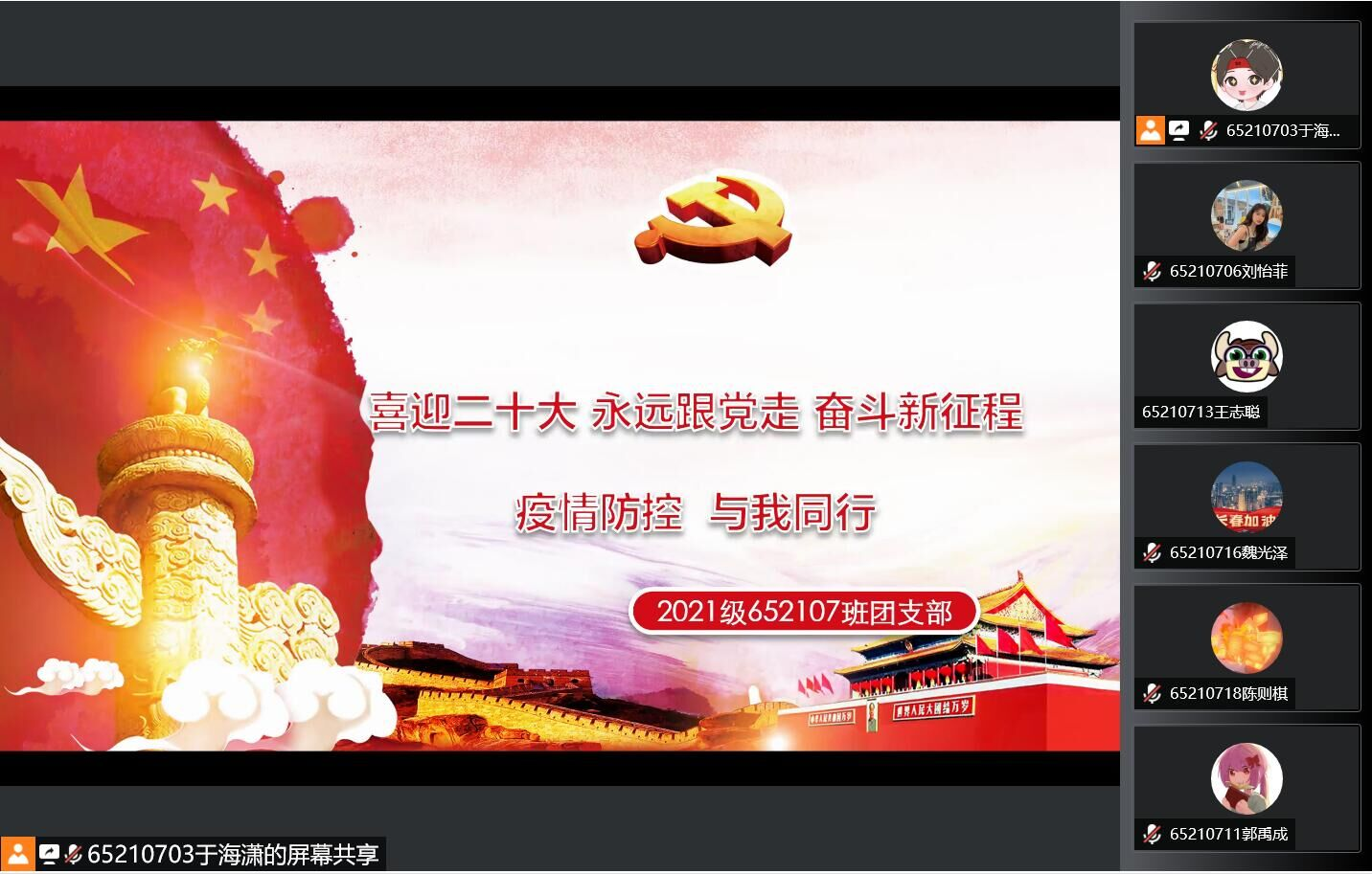 为响应全面贯彻党的十九大和十九届历次全会精神,深入学习习近平总书记关于青年工作的重要思想,best365体育亚洲652107团支部于2022年4月13日10:00,线上开展了以《喜迎二十大、永远跟党走、奋斗新征程》为主题的团日活动。本次活动由团支部书记于海潇主持,支部全体同学参与了本次活动。