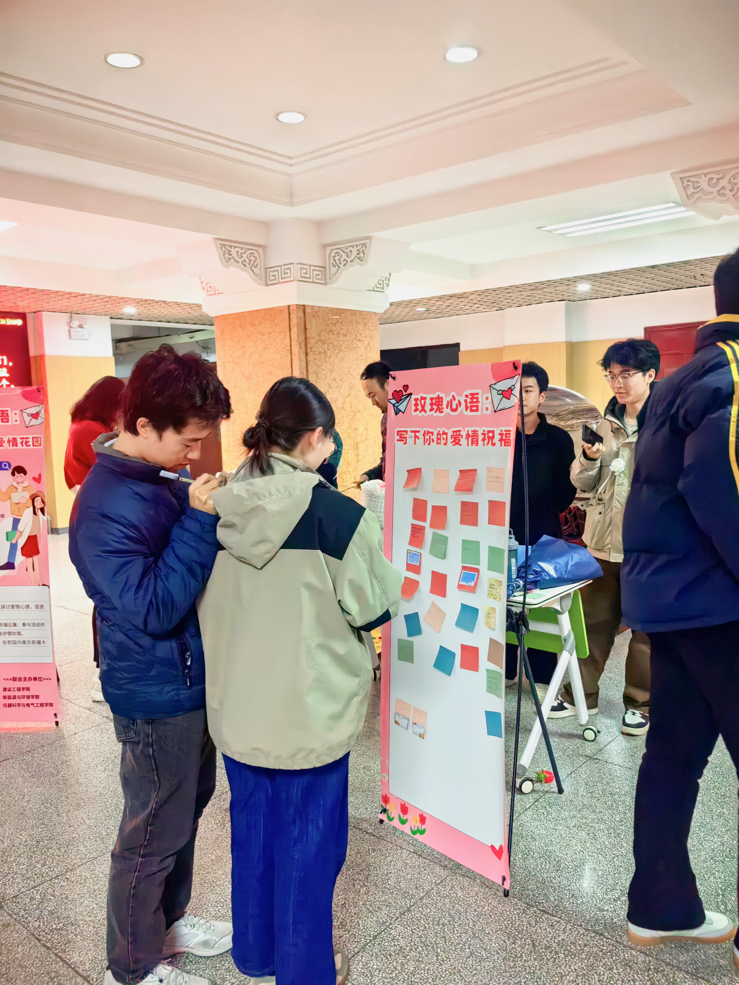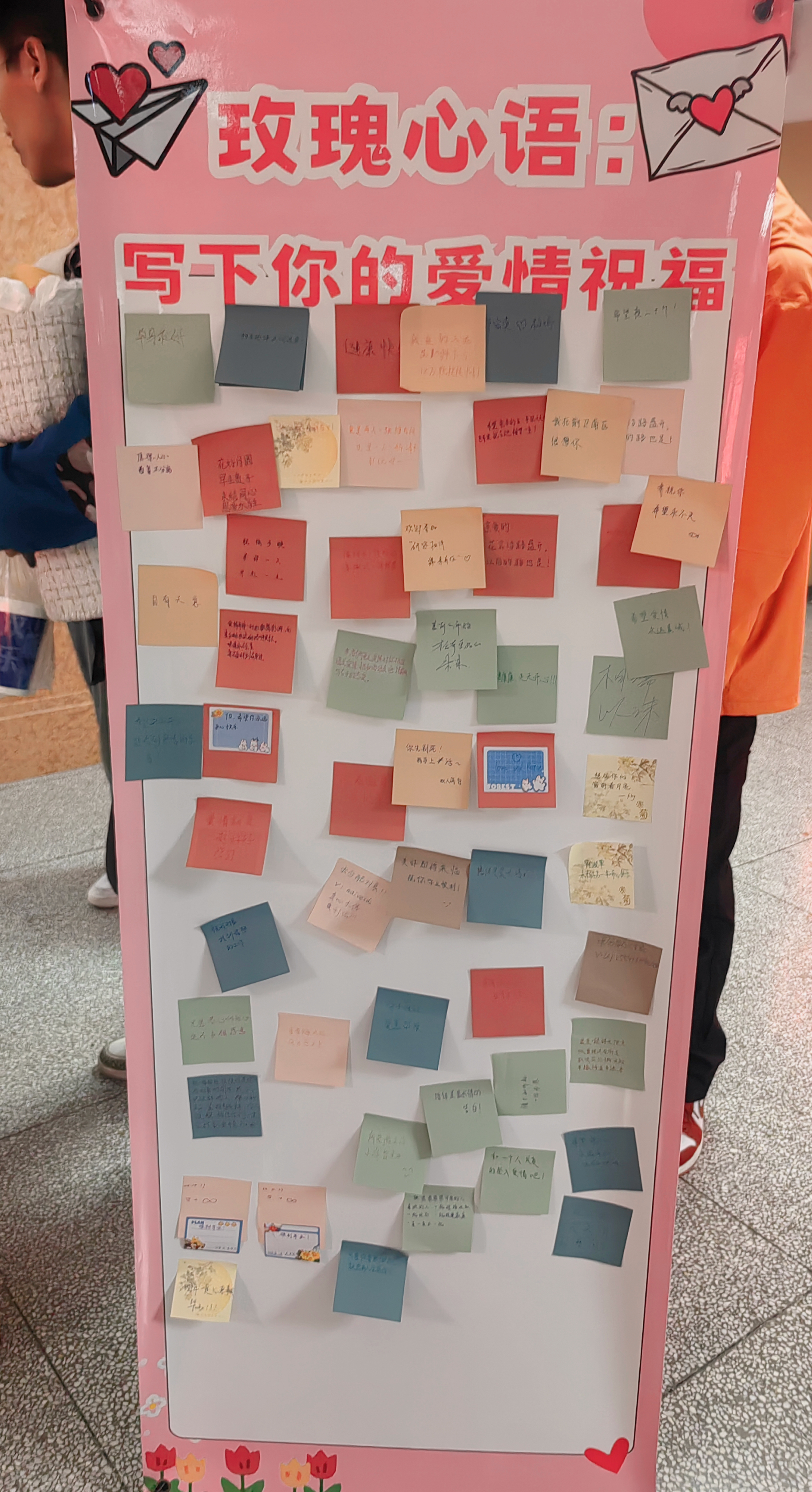 随后,同学们在美丽的玫瑰花旁,写下对爱的理解与祝福,并将其挂在活动现场的“爱情祝福展板”上。现场氛围温馨而感人,大家纷纷表示希望在未来能够更好地理解自己和他人,将弗洛伊德的爱情观运用到日常生活中。