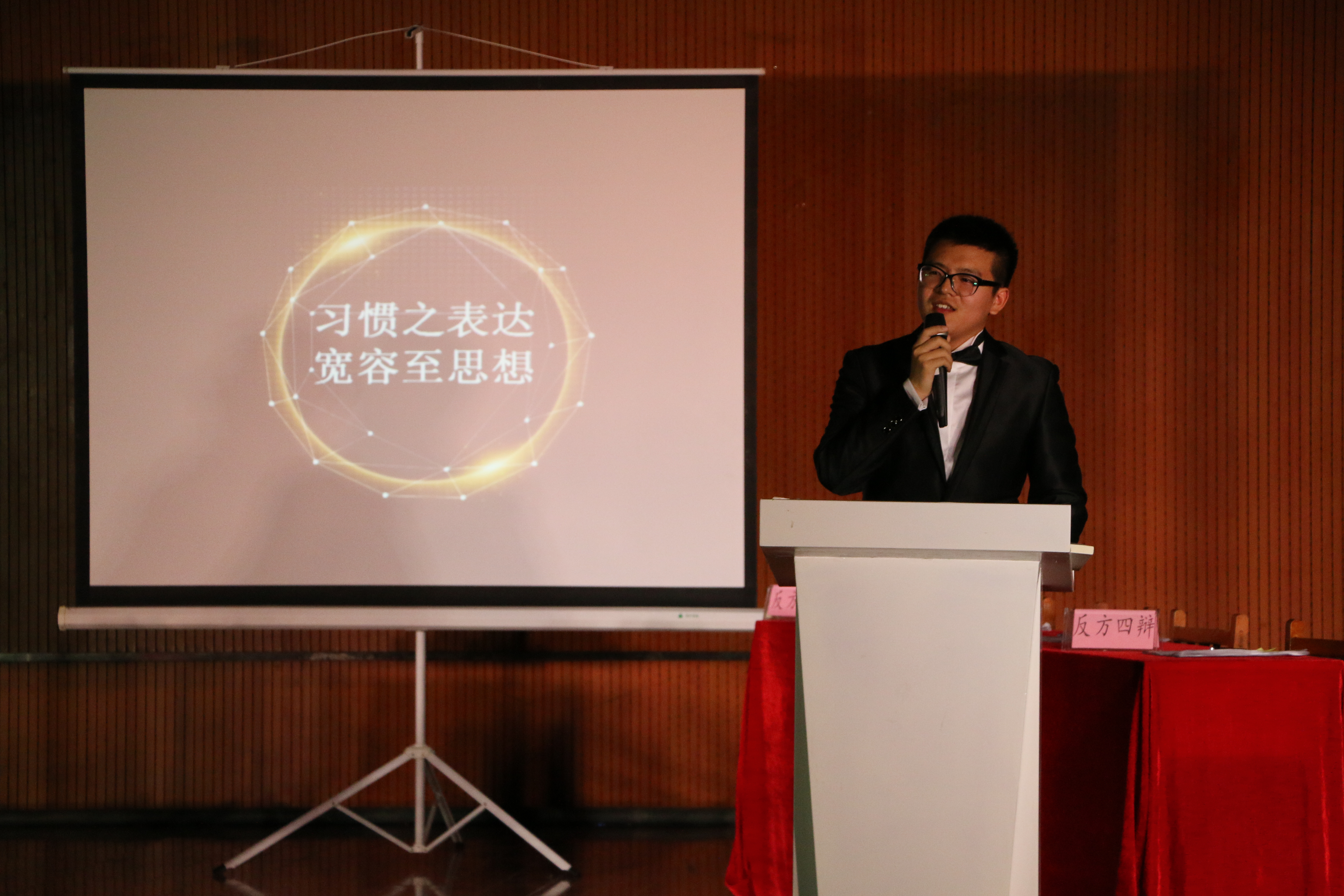 1830分,报告厅的灯光突然暗下,全场的目光聚焦在舞台上。晚会由公司生声论坛成员自主设计的宣讲视频开始。六分钟精彩的宣传视频生动有趣的向大家逐层渗透了生声责任、思考、表达、分享的核心理念。热烈的掌声中,生声论坛的员工创始人公司151班马松辰同学带着一句经典的“风声雨声读书声,声声入耳;家事国事天下事,事事关心”登上演讲台。配合简洁明了的幻灯片,他用生动的语言,丰富的例子向大家依次讲述了“广博之阅读,深邃至灵魂;焦虑之思考,自由至信仰;习惯之表达,宽容至思想;无限之分享,人文至创意;豁达之尝试,恪慎至责任”的社团拓展理念,倡导当今老员工广泛阅读,多思考,多交流,明确自己的责任与担当,同时也用肺腑之言表达了自己和团队创立社团一路走来的心路历程。最后,马松辰同学引用雅思贝尔斯在《什么是教育》中的一段话:精神贵族是从各阶层中产生的,其本质特征是品德高尚、个体精神的永不衰竭和才华横溢,因此精神贵族只能是少数人,大学的观念应指向这少数人,而芸芸众生则在对精神贵族的憧憬中看到了自身的价值。作为宣讲的结束。