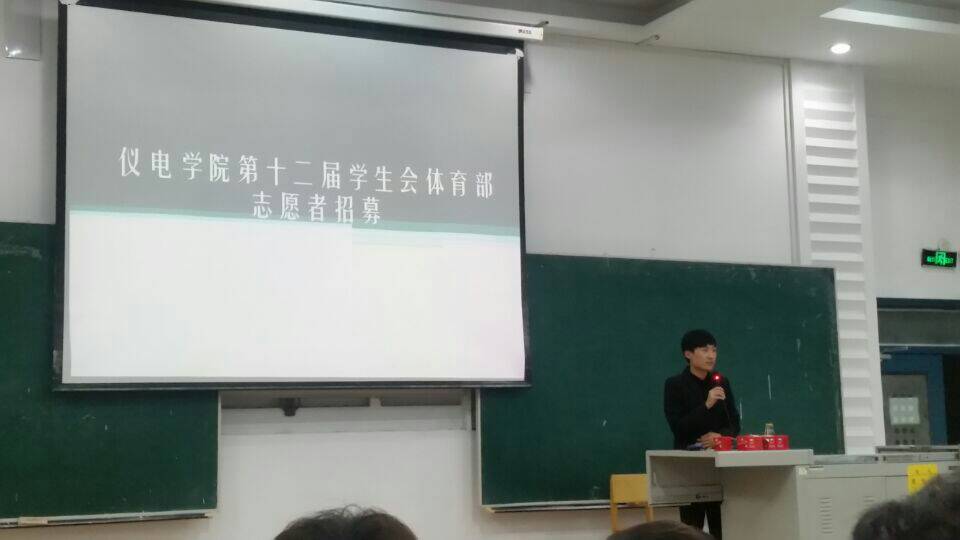 26日晚5点,体育部见面会在经信教学楼F9阶梯教室举行。首先,部长孟金对各位副部长的加入表示了欢迎,其次,部长与各位副部长依次进行了自我介绍增进了彼此的了解,最后,部长对体育部近期的工作任务进行了简单的总结与指导,540分,见面会议圆满结束。晚6点,公司志愿者招募大会如期召开,大会上,部长进行了精彩的志愿者招募宣讲,大会结束后,体育部开始进行志愿者面试,最终从诸多面试者中选出了十位较为优秀的员工作为志愿者。