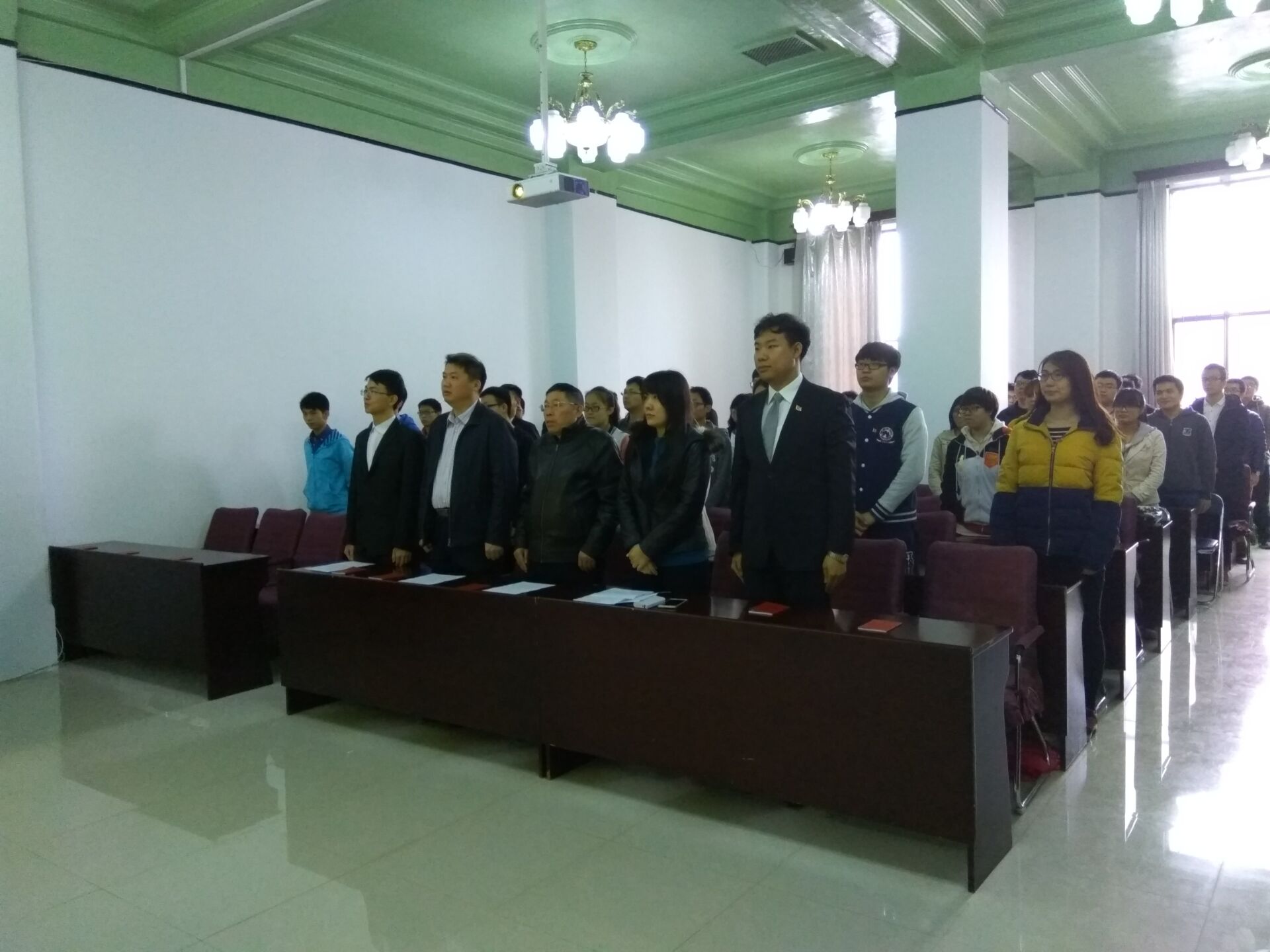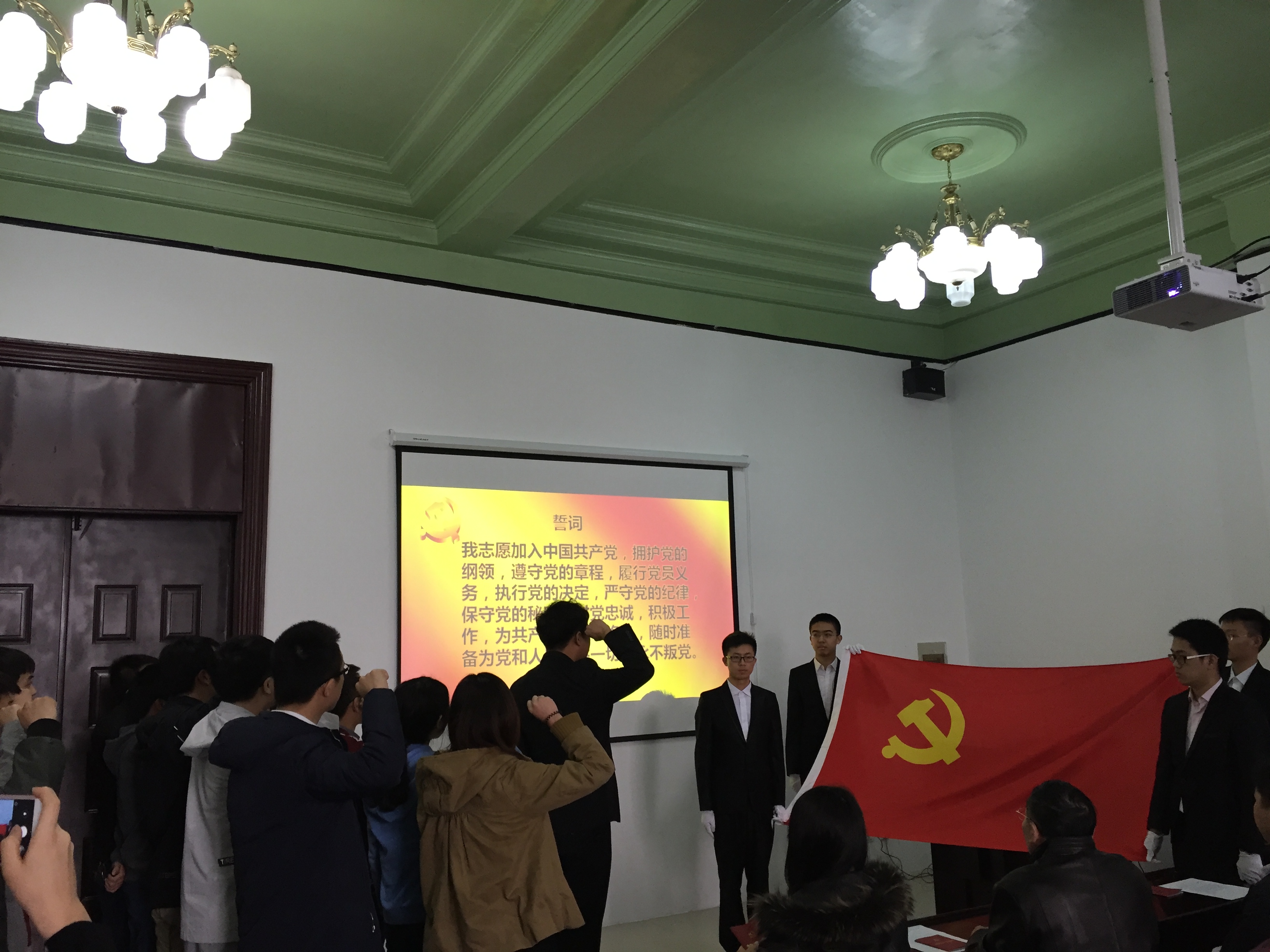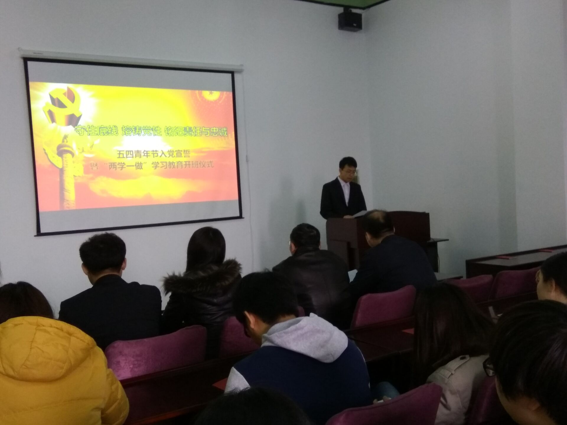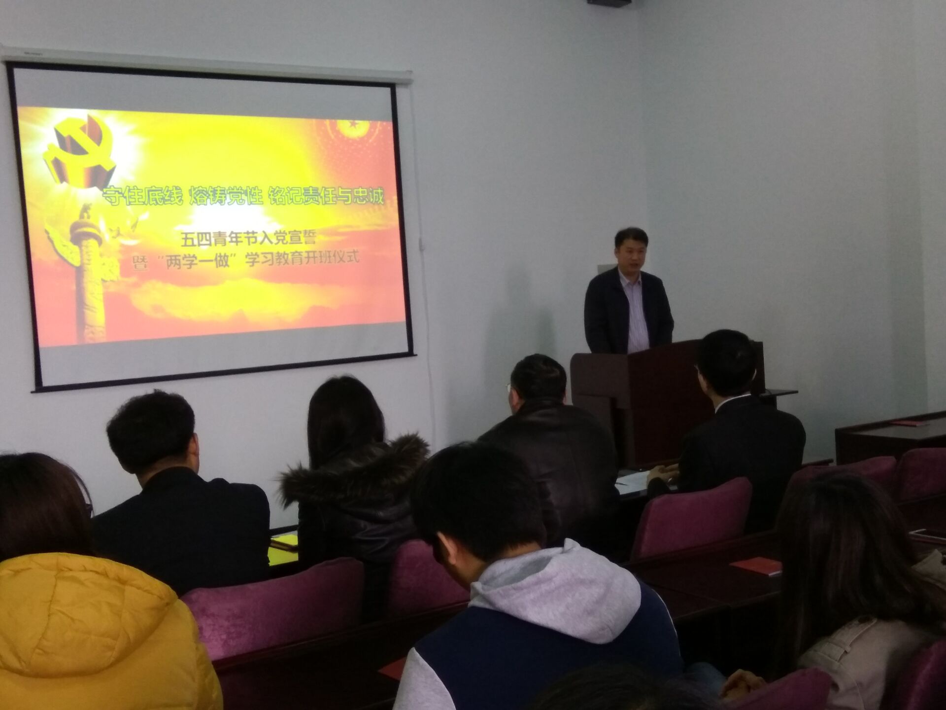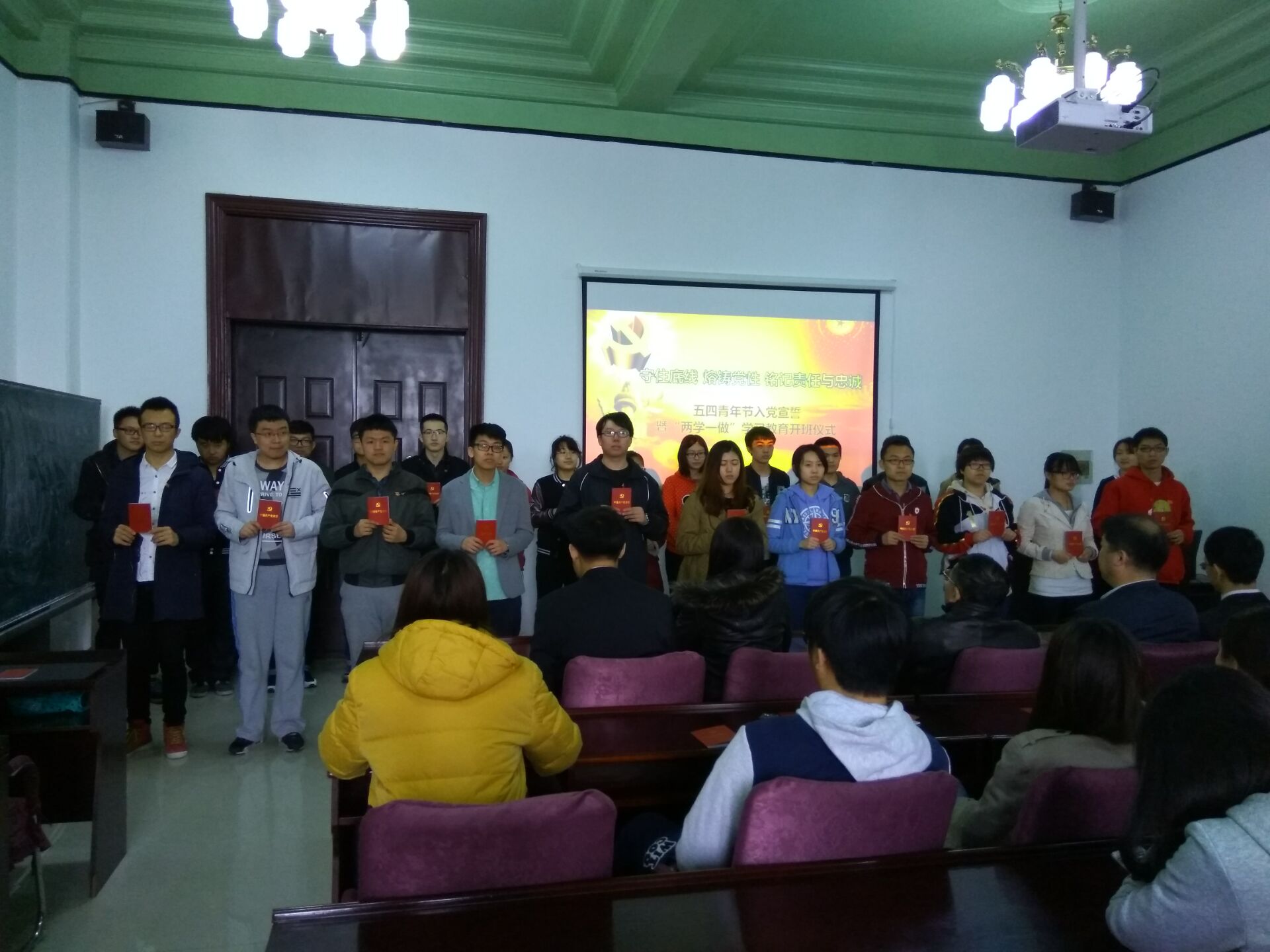 为弘扬五四爱国精神,坚定广老员工党员的理想信念,部署“两学一做”相关工作,best365体育亚洲本科生党支部于2016年5月4日12:30在朝阳校区地质宫208室举行了五四青年入党宣誓暨“两学一做”学习教育开班仪式,公司党委书记余国友教授、党委副书记兼副经理邱增凯老师、员工工作办公室主任王冕老师、本科生党支部全体党员和入党积极分子参加了本次会议。
