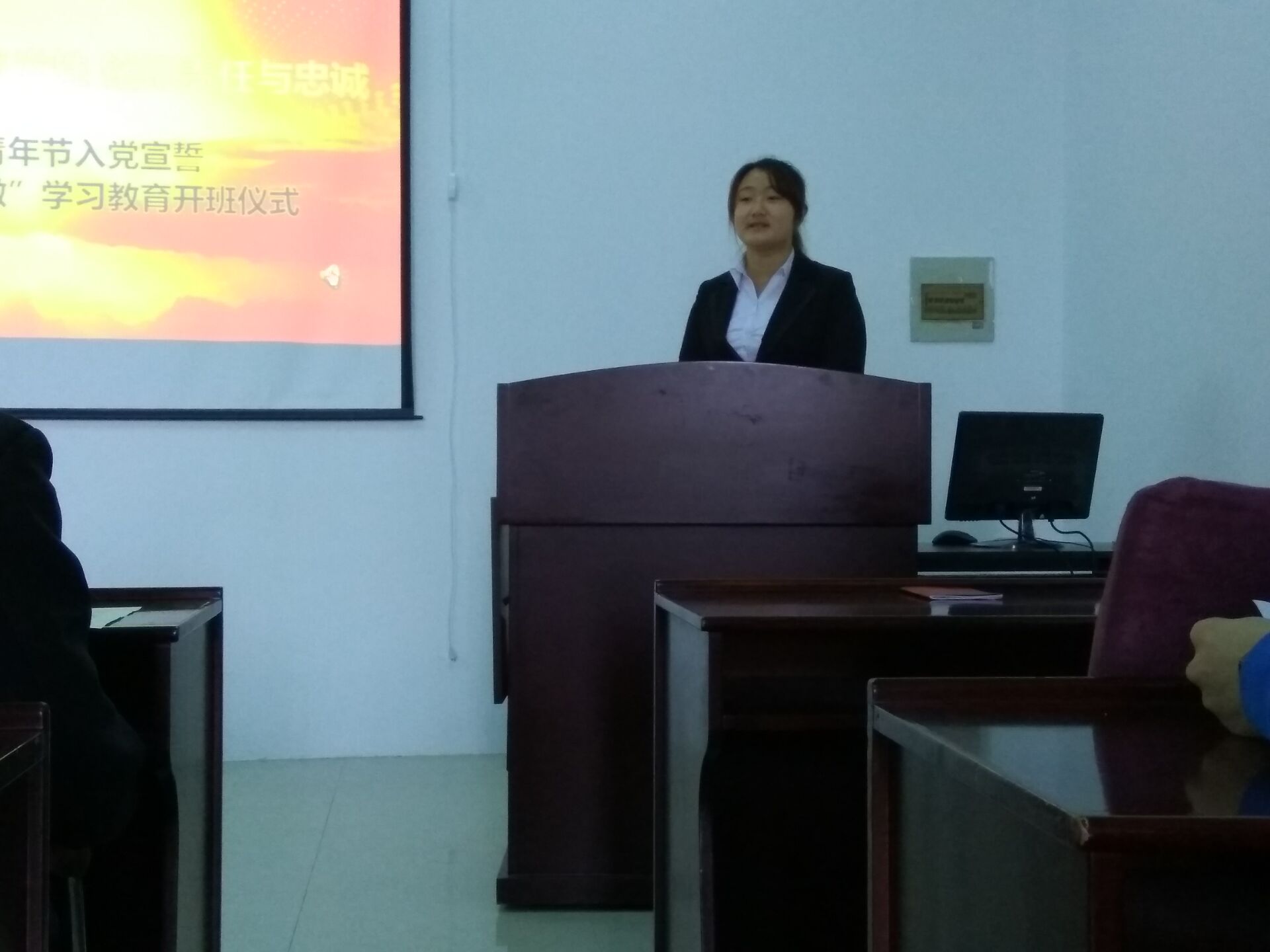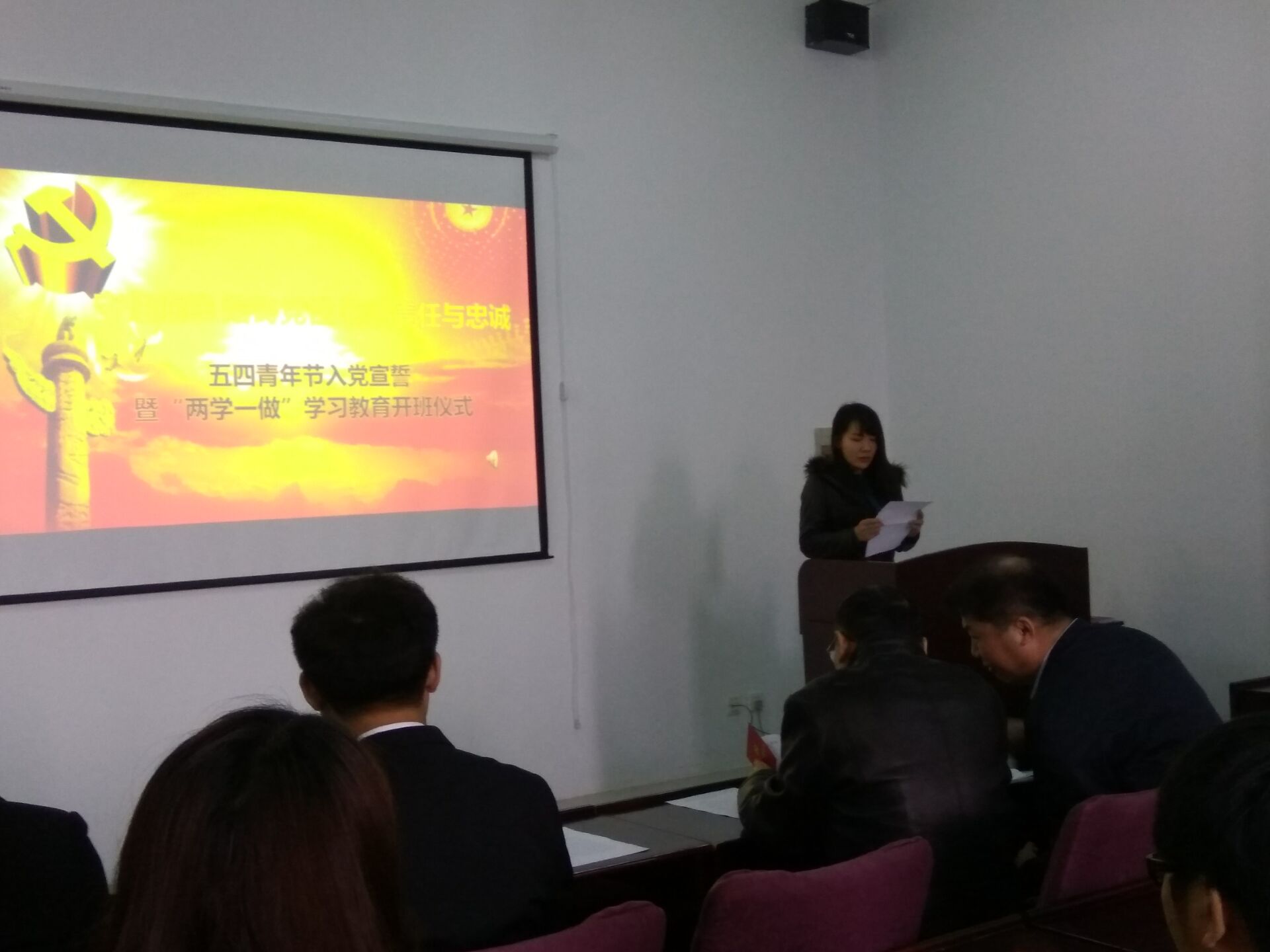 宣誓仪式在雄壮有力的国际歌中拉开序幕。首先,公司员工工作办公室主任王冕老师宣读了24名新发展党员名单。随后,在员工党员李昊阳同志的带领下,新党员集体上前宣誓,他们举起右拳,面对党旗,神情庄重地宣读了誓词,抒发了对党忠诚的决心。宣誓结束后,老党员又一一为新党员佩戴党徽并发放党章,祝贺他们光荣加入中国共产党。随后,预备党员代表赵成同学上前发言,他对党组织的深切关怀及各位党员同志的关心和帮助表示了深深的感谢,并表示将牢记入党誓词,勤奋工作、刻苦学习,时刻以党员标准严格要求自己,做一名合格的共产党员。最后,公司党委副书记兼副经理邱增凯老师讲话,他希望每一个党员终生都以这个神圣的时刻激励自我,践行入党誓言,为党的事业不懈奋斗。希望党员同志们以此次大会为新起点,更加严格要求自己,进一步学习党的基本理论和知识,增强党员的责任意识,在工作中勇挑重担,努力完成自己的本职工作,同时做到以下几点:第一,正确处理好个人利益与集体利益的矛盾,在工作、学习和社会活动中起模范带头作用。第二,按时向党组织汇报思想和工作情况,努力做一名合格的共产党员。与此同时,邱增凯老师也希望全体积极分子坚定信念,求取成绩,创造条件,通过实际行动向党组织靠拢,早日实现自己的人生追求。随后邱老师对员工党支部“两学一做”学习教育活动进行了具体安排部署。