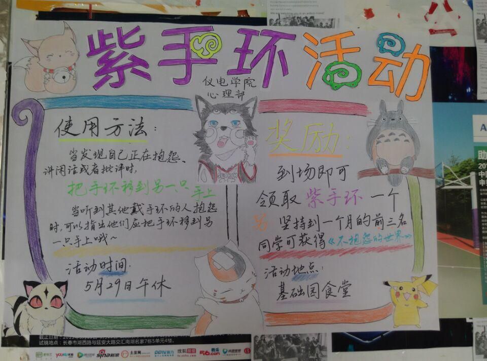 5月27日公司心理部副部及部员在李四光二楼的展板上张贴了关于此次活动的海报,海报上标明了紫手环的使用方法及活动的时间和地点;5月28日课间,活动人员在李四光教学楼中的黑板上写明了紫手环活动的时间、地点、举办公司、具体内容以及奖品情况;28日晚,心理部全体部员进行了走寝宣传,通过一系列的前期宣传工作,让更多同学了解紫手环活动,引起同学们的兴趣。虽然心理部的同学们为了海报的设计绞尽脑汁,为了此次活动的宣传牺牲了课余休息时间,但同学们仍洋溢着幸福的笑容,丝毫没有抱怨和疲惫。