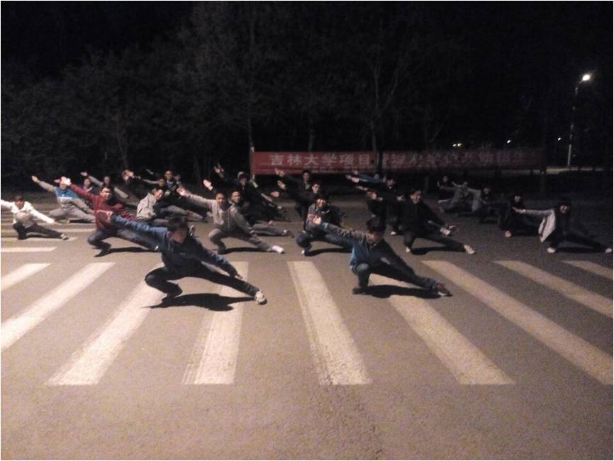 三路长拳的训练在每天2030拉开序幕。首先,由2013级参加上届运动会三路长拳比赛的学长向队员们讲述动作要领,并亲身示范细节上需要注意的方面。随后,在学长的带领下,全体三路长拳团队队员整齐划一地列好方阵,每晚都认真进行多达十余次的整套动作的演练。在紧凑有力的伴奏声中,每一位队友都热情满满,即使有几天由于天气原因不能在室外训练,队员们也没有松懈,把训练场又室外转向了室内。辅导员老师也来到训练场地,对大家的辛勤训练给予高度的赞扬。大家力求把每一个动作做到精准、到位,虽然训练量较大,训练时间较紧,但没有一个队员喊苦叫累,团队凝聚力得到了充分的彰显。每次训练历时两个多小时,最终都是在团队间相互分享动作心得的交流沟通中落下帷幕。
