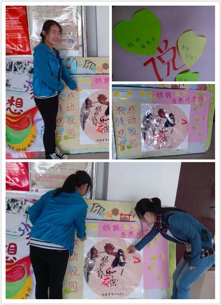 此次活动号召大家从点点滴滴做起表达母爱,例如为母亲写一句话,发一条短信感恩母爱。节日当天,同学们纷纷拿出笔和纸在我们预先准备好的活动展板上留言,十分动情的写下想对母亲说的话。我们在母亲的节日里深情地回味母亲为我们做的点点滴滴,说出了我们本应早就该说,却一直埋藏在心里的想对母亲说的话。“世界上只有一位最好的女性,她便是慈爱的母亲,世界上只有一种美丽的声音,那便是母亲的呼唤……”、“妈妈您辛苦了!”、“原谅我的任性叛逆,妈妈我爱你”……同学们都写出自己在心底最想对妈妈说的话,通过活动主办人员的鼓励,大多数同学也都将这些话编成短信发送给自己的母亲。
