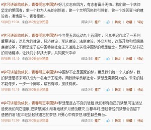 自5月8日开始,由班级团支书在本班团支部微博平台结合时事以及班级同学学习情况发表关于习近平总书记系列讲话的学习内容微博。同学们于5月8日-13日期间在本班团支部微博平台阅读学习,并发表微博讲述自己关于何为中国梦,当代老员工如何实现中国梦的看法与见解,以此作为理论学习的主题。过程中,同学们针对“为实现‘中国梦’,当代老员工应该做些什么?”这一问题展开论述,同学们积极发言,探讨当代老员工如何在中国特色社会主义道路上实现中国梦的理想信念,并积极思考自己的理想与追求。很多同学谈到,当代老员工不仅要学好科学文化知识,更要加强在道德、文化等方面的个人修养,弘扬五四精神,为实现中国梦贡献自己的一份力量。