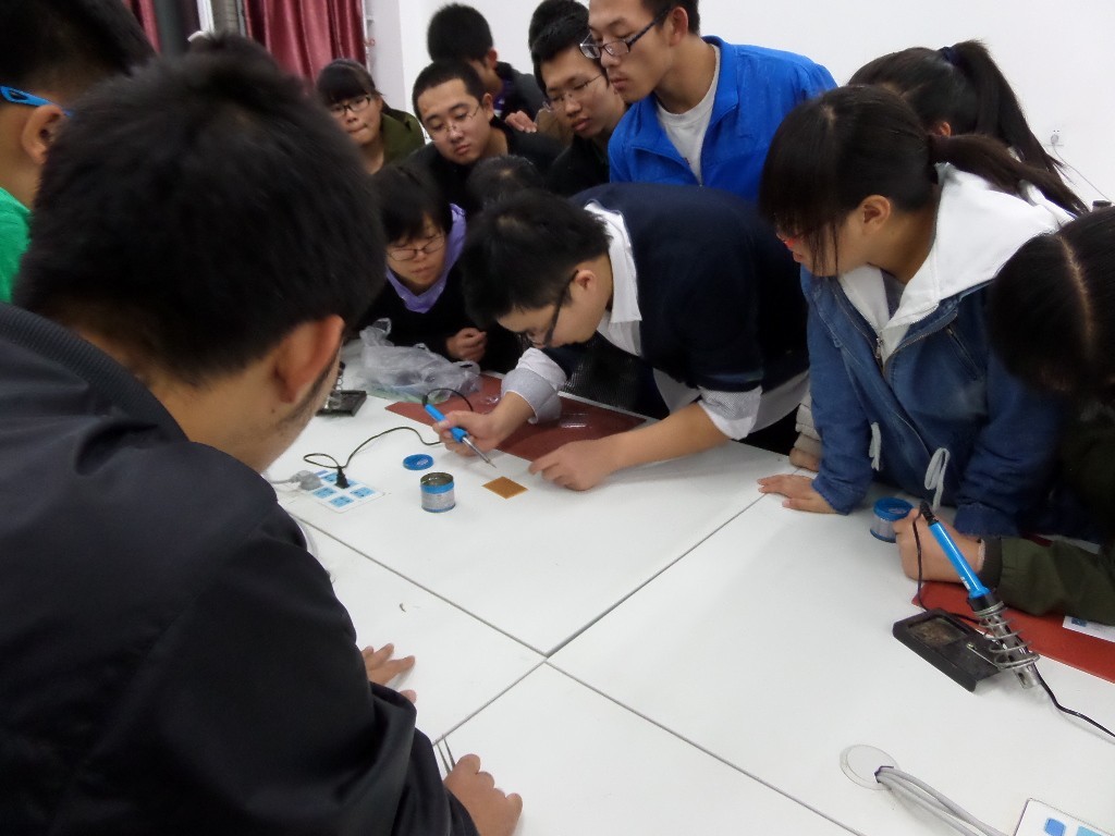 通过第一期的培训,同学们对基础的电子知识有了一定了解,此次培训的内容是电子元件的焊接。首先,科技协会骨干成员向大家详细地介绍了焊接电路的基本操作方法和注意事项,随后他亲自为学员们做了示范,在示范的过程中强调了焊接电路过程中容易出现的错误,提醒同学们一定要认真操作,注意实验安全。学员们都认真细致地观察听讲。电路焊接过程中,同学们谨慎细致,遇到疑惑的地方积极向学长请教或展开小组讨论,充分展现了科技协会“合作探索,求实创新”的精神理念。培训活动持续了近三个小时。