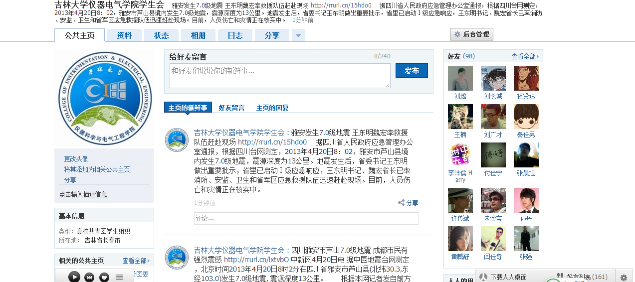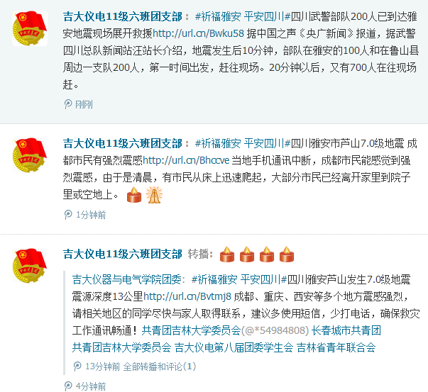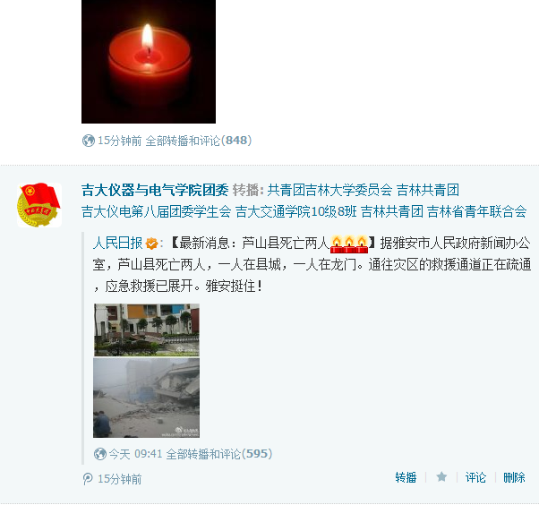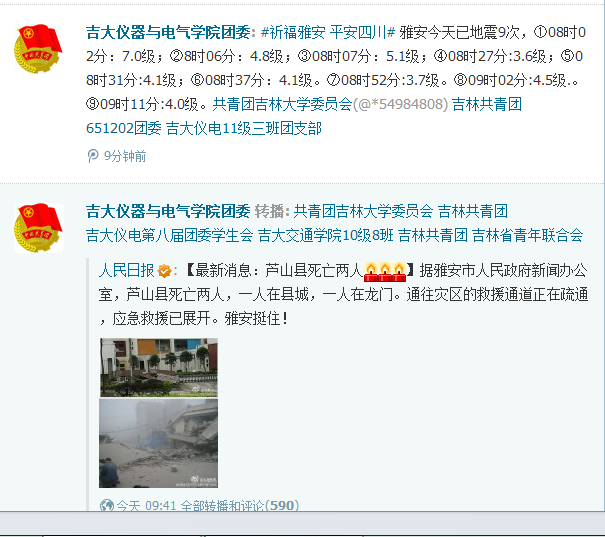 2013420上午8点左右四川省雅安市芦山县发生7.0级地震, 震源深度13公里,成都、重庆、西安、贵阳等地都有不同程度震感,芦山老县城一大批旧瓦房几乎全部倒塌,截止该日上午11:30已有30人遇难,四川省地震局初步统计伤亡人数将上百人。灾情牵动着全国人民的心,也牵动着青年员工的心。在获知地震灾情后,best365体育亚洲团委运用微博、人人网等新媒体工具第一时间向公司青年师生发布灾区信息,各班级团支部利用微博等关注灾情,广大青年员工在网络上第一时间向四川雅安地震灾区传递祝福。