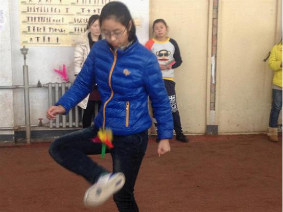 比赛在中心校区体育馆长廊进行队员们提前入场热身,将身体调整到最佳状态。毽球对抗赛中,队员们用腿和脚来完成各项高难进攻防守动作,“毽球”的网前扣杀和险象环生的防守技术,无不令人称奇。队员们英姿潇洒不断变换各种各样的花式,让观众们眼花缭乱,大呼精彩。一次次成功进攻,一次次绝妙的防守,使与对手的比分不断被拉开。现场的啦啦队也连忙为队员们助威加油,比赛进入了高潮。助威声,队员的呼喊声连成一片,我队控制了比赛的节奏和进度,最后以大比分领先取得了胜利。“平踢毽”项目比赛中,双方斗智斗勇,毽子在空中飞来飞去,你踢我接,扣人心弦。队员们个个奋勇向前,努力拼搏。在落后的情况下互相鼓励,不急躁,不气馁,不互相埋怨,充分发扬了团结协作的精神。同时赛出了激情,踢出了活力,打出了自己最佳的水平。最后,女子团体获得了二等奖。
