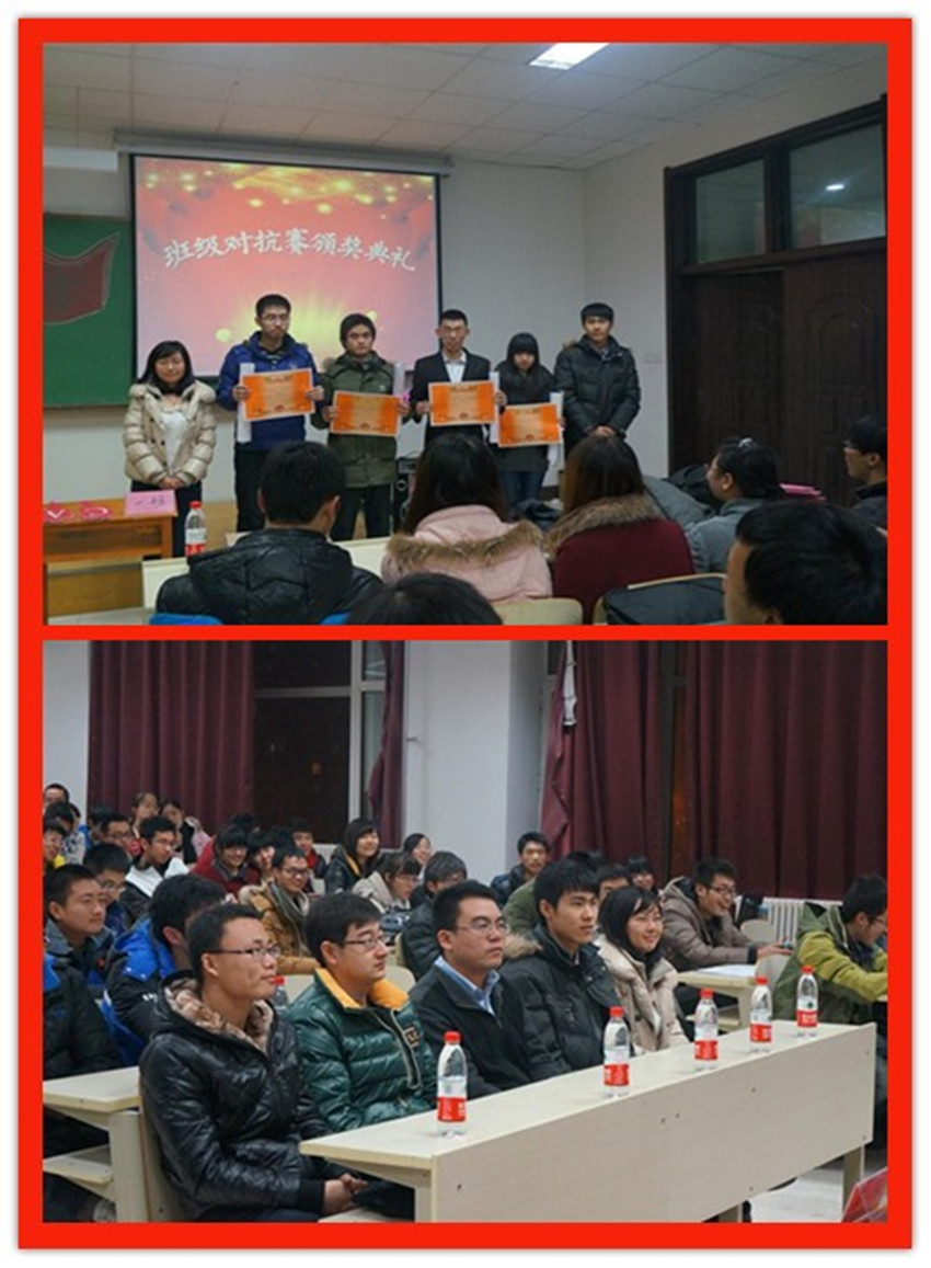 为更好地关注基础园区低年级员工的健康成长和全面发展,丰富广大同学的课余生活,提高同学们的综合素质,增强团队协作精神和集体凝聚力,best365体育亚洲第八届分团委、员工会于2012年10月至12月开展了兄弟班级对抗赛系列活动。2012年12月13日晚,兄弟班级对抗赛颁奖典礼暨总结表彰大会在中心校区李四光楼210室举行。院团委副书记兼2011级辅导员朱宇、2012级辅导员蔡印、第八届分团委副书记李娇阳、员工会主席朴冠宇及分团委、员工会全体员工干部出席了活动,2012级全体新生同学参加了活动。