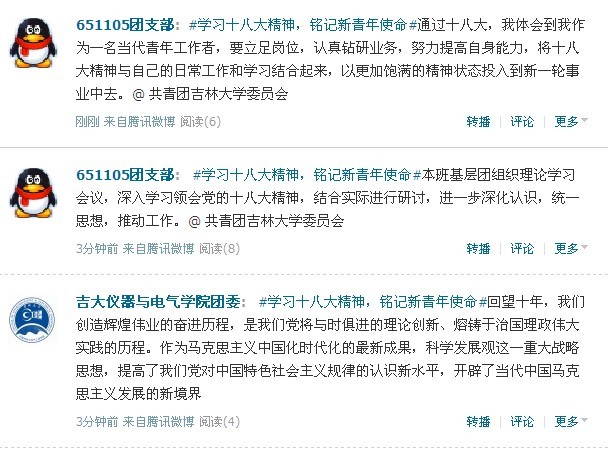 公司团委号召各班级团支部要高度重视并把学习宣传贯彻党的十八大精神作为当前和今后一个时期的首要政治任务,把这项工作摆在突出位置,集中力量,抓好落实,大力创新活动形式和载体,力求贴近员工的思维方式和认知习惯,不断积极创新总结,扎实推进微博学议十八大活动,不断掀起学习宣传贯彻十八大精神的新高潮