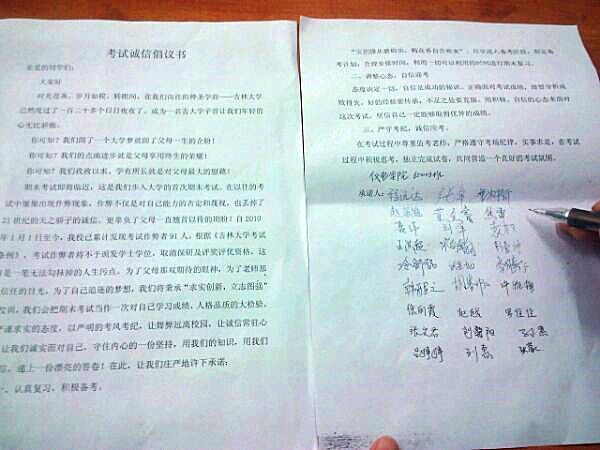 为进一步加强学风建设,全面提升员工诚信意识,优化考风考纪,营造良好的考试氛围,在20112012学年第一学期期末考试临近之际,公司组织2010级全体本科员工签订了《考试诚信倡议书》,倡导同学们诚信考试。