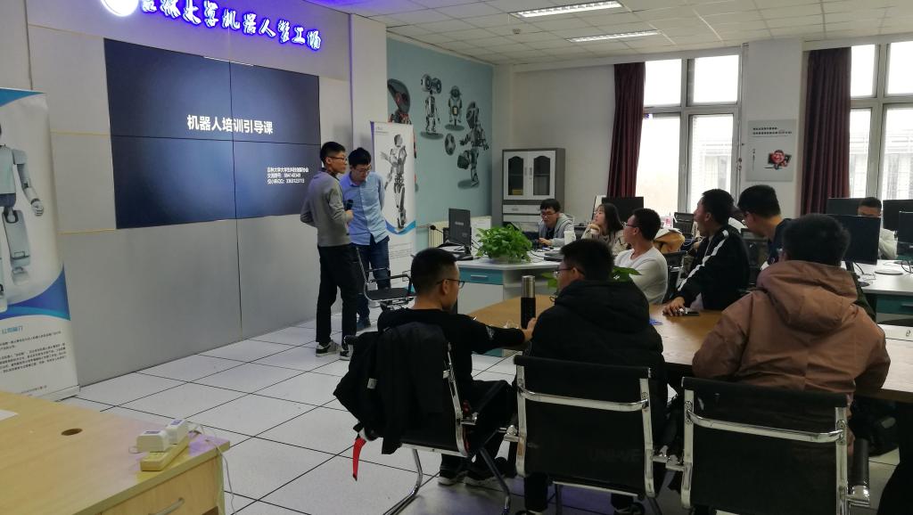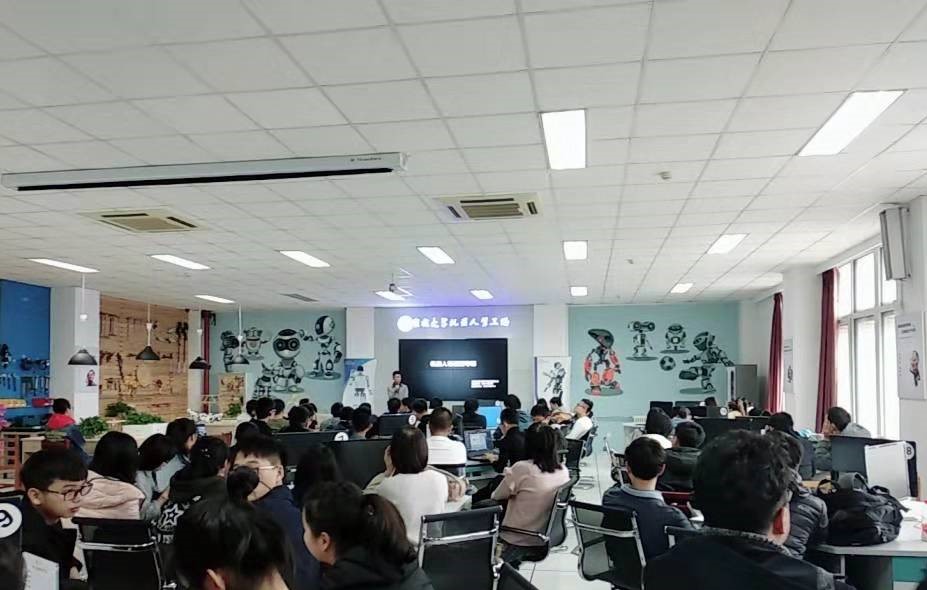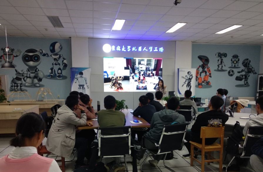 培训活动伴随着两台UBTECH机器人的开场舞正式开始。在简单介绍之后,滕泽远同学首先对武术擂台赛机器人设计目的和设计原理进行详细讲解,使同学对比赛内容有了一定了解,接着带领同学观看了小车对抗比赛的视频,激烈紧张的比赛让同学们对武术擂台赛机器人燃起浓厚兴趣,随后带领同学运用Luby Creater软件对机器人的代码进行设计,详细的讲解和现场操作引来同学们的阵阵掌声,将引导的气氛推向高潮。高鑫宇同学接过话筒,首先风趣地讲解了人形机器人的结构,贴合人形机器人对抗赛的比赛规则,一一讲述了各个部件的作用以及比赛时的战略部署和调试技巧,接着对人形机器人各项赛事进行详细介绍,着重强调了比赛规则和得分方法,在比较容易出现疑问的部分,高鑫宇同学以视频介绍的方式带领同学们一起思考,加深了大家对比赛的理解,使同学们收获匪浅。随后惠乾鑫同学走上讲台进行总结,提出幽默诙谐的问题与大家进行交流,大家各抒己见,通过交流,对同学们的想法表示强烈支持,并且依据自己多年的比赛经历,同学们提很多珍贵的实战经验,同学们他的耐心指导也都谨记在心,另一方面他着重强调了比赛时的心态,良好的心态决定着比赛时的正常发挥,而且要拒绝畏难情绪,出现问题就要去解决问题,结果的好坏并不重要,重要的是在比赛中学到经验和知识,同样的问题下次遇到便迎刃而解了。
