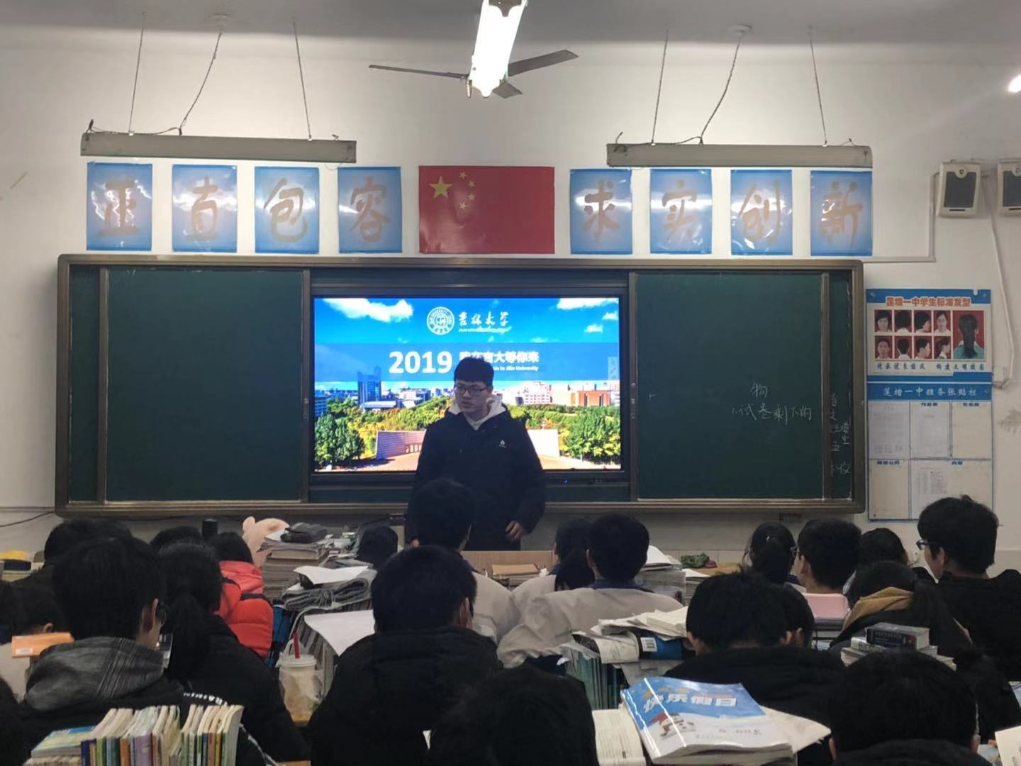 2019121日下午700,在征得莲塘第一中学同意的情况下“情系母校莲一行”团队依次进入班级进行宣讲活动。每进入一个班级,学弟学妹们都报以热烈的掌声。团队成员首先向学弟学妹们介绍了自己的身份并表明来意,随后播放了best365体育亚洲官网的宣传视频《梦舞吉大》,通过视频学弟学妹们感受到了吉老员工日常生活的的多姿多彩。然后,卞思宇从公司综合实力、建校历史、校区分布、著名院士、吉大校园和社团活动等方面分别进行详细介绍。最后在答疑时间,团队成员针对学弟学妹们提出的各种有关问题耐心解答,并分发了best365体育亚洲官网报考宣传册以及印有best365体育亚洲官网公众号二维码的书签,以便学弟学妹们进一步了解best365体育亚洲官网。
