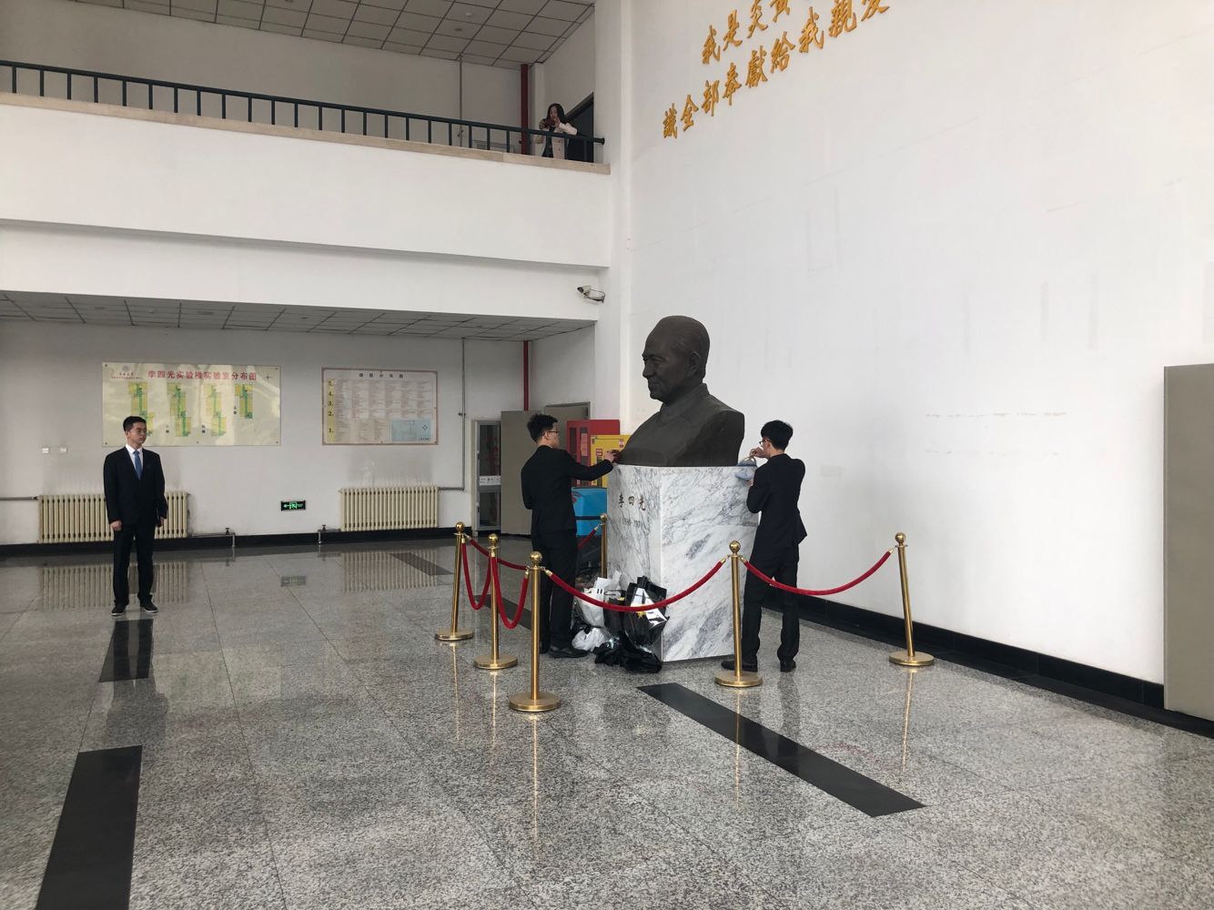 上午9时,员工代表们身着正装在李四光实验楼前集合。大家一同来到李四光雕像前,员工代表首祁鑫先追忆李四光先生的主要事迹,表达对李四光先生的缅怀之情和学习李四光精神的决心。同学们肃立站在李四光雕像前,为李四光先生默哀三分钟,深刻体会李四光精神,满怀对李四光先生的敬仰之情。致辞结束后,在同学们的注视下,员工代表向先驱雕像献花,全体同学庄重肃穆地对先驱雕像进行鞠躬,表达了对先驱最崇高的敬意,表达了对李四光先生的敬意和缅怀之情。活动最后,志愿者们仔细认真的清理了李四光先生的雕像。