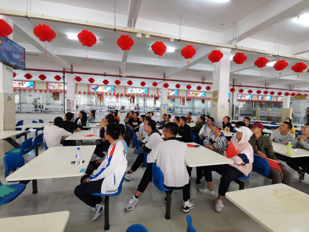 活动伊始,伴随着激昂雄壮的国歌声,五星红旗冉冉升起,迎风飘扬,大家纷纷肃立注目、奏唱国歌。随后,2019级共青团员代表在前卫南区基础园餐厅一同观看庆祝中华人民共和国成立70周年阅兵式直播。代表们聚精会神,认真收看,两个多小时的阅兵结束后,大家意犹未尽,纷纷畅谈体会,立志与祖国共奋进,为中华民族的伟大复兴贡献自己的一份力量,让祖国为有我们而骄傲。现场气氛十分热烈,在全场的热烈的掌声中,本次主题团日活动圆满结束。