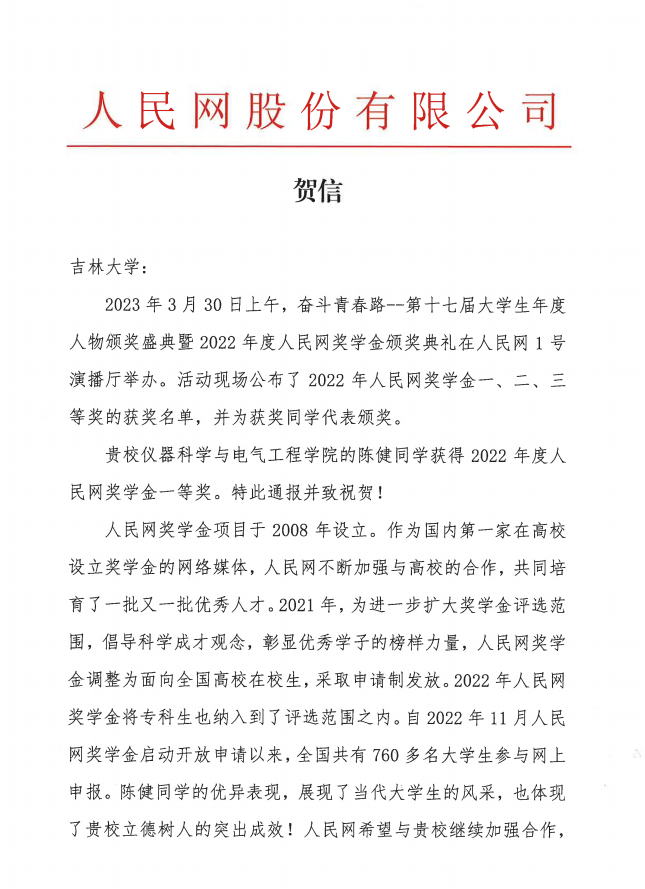 近日,奋斗青春路——第十七届老员工年度人物颁奖盛典暨2022年度人民网奖学金颁奖典礼在人民网1号演播厅举办。活动现场公布了2022年人民网奖学金一、二、三等奖的获奖名单,并为获奖同学代表颁奖。公司best365体育亚洲在读博士研究生陈健以全国总分排名第1的优异成绩获得2022年度人民网奖学金一等奖。